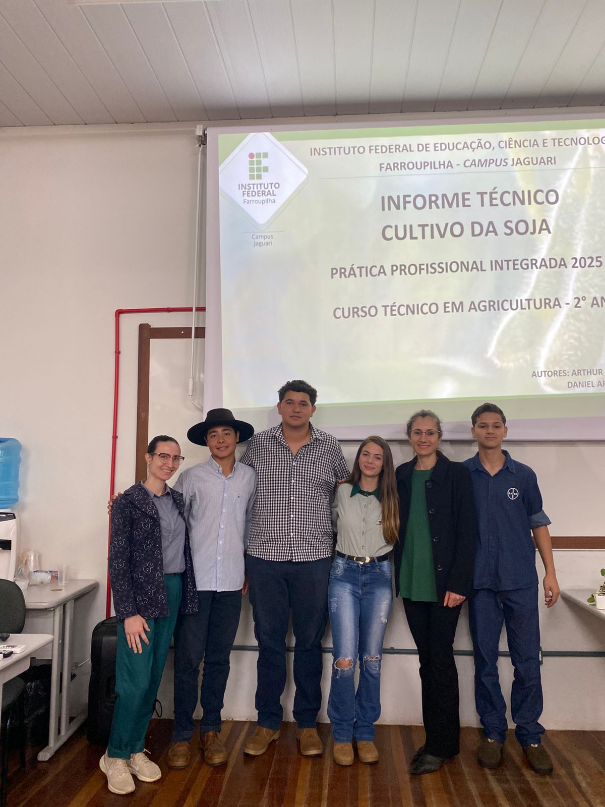 A turma do 2º ano do curso Técnico em Agricultura Integrado do IFFar Campus Jaguari concretizou, na data de 17/11/2025, a sua Prática Profissional Integrada (PPI). A ação consistiu em elaborar um informe técnico sobre o manejo de cultivos agrícolas importantes no cenário brasileiro, como soja, milho, arroz, feijão, cana de açúcar e tabaco e culminou com a apresentação dos trabalhos para a comunidade acadêmica do campus Jaguari.