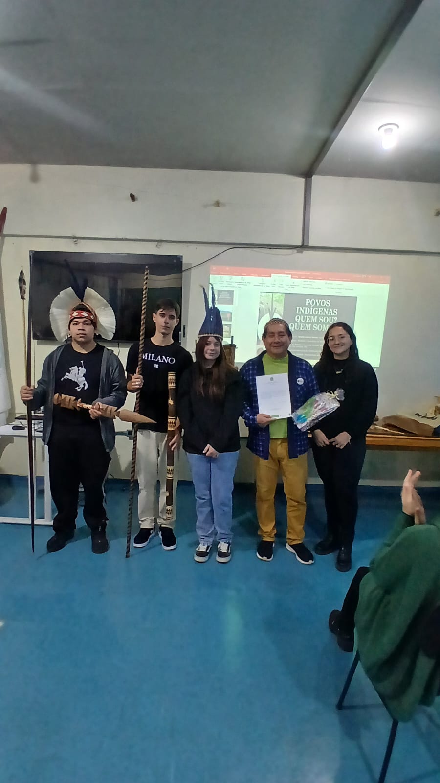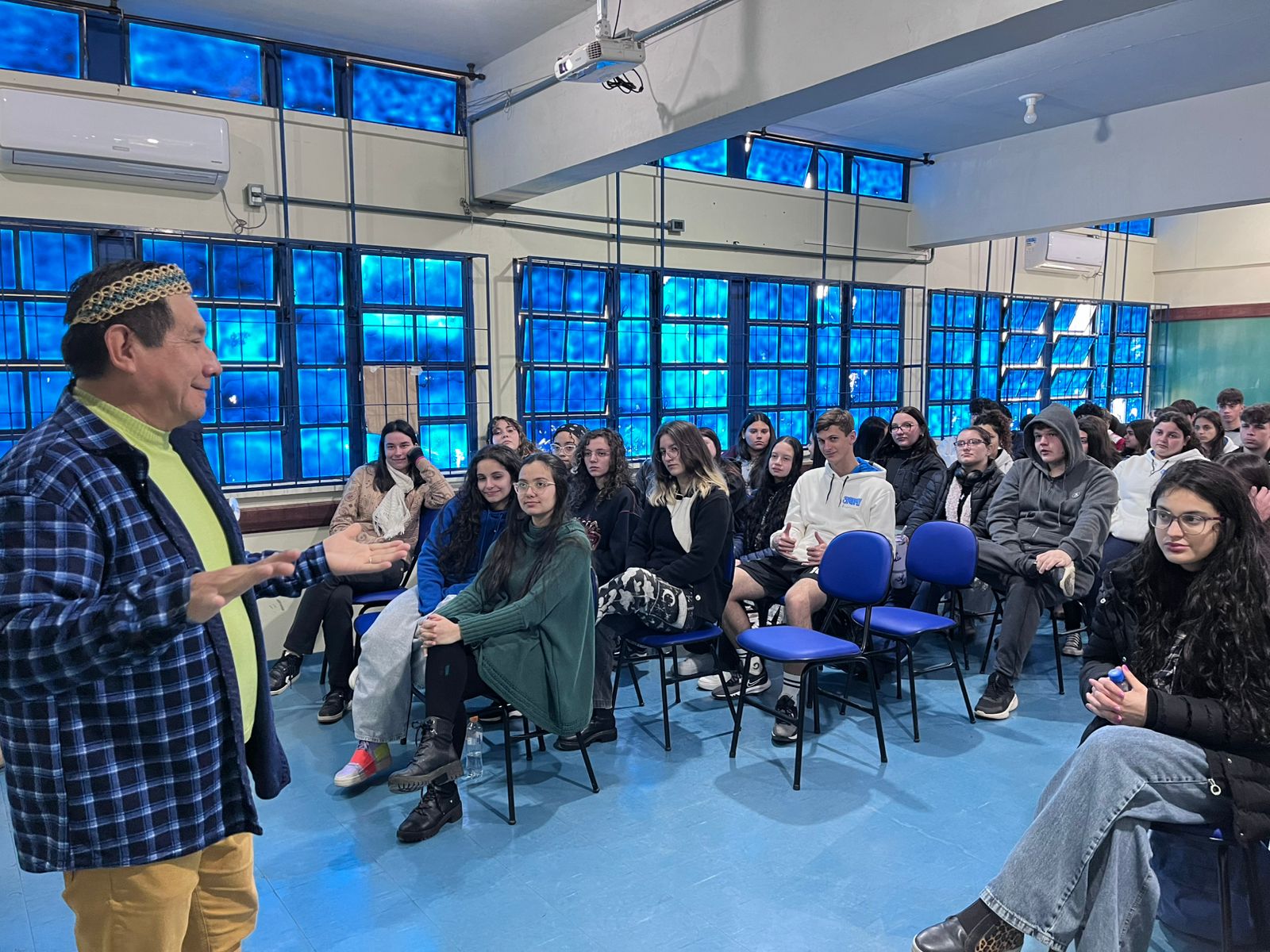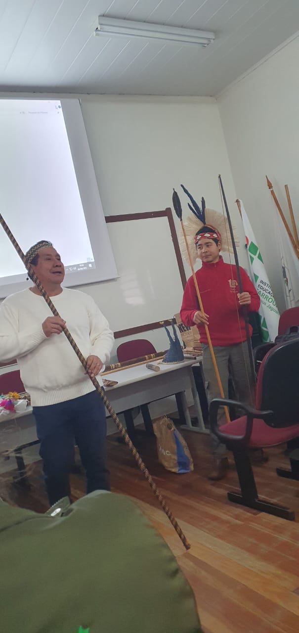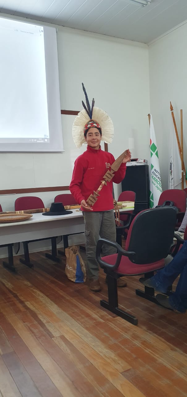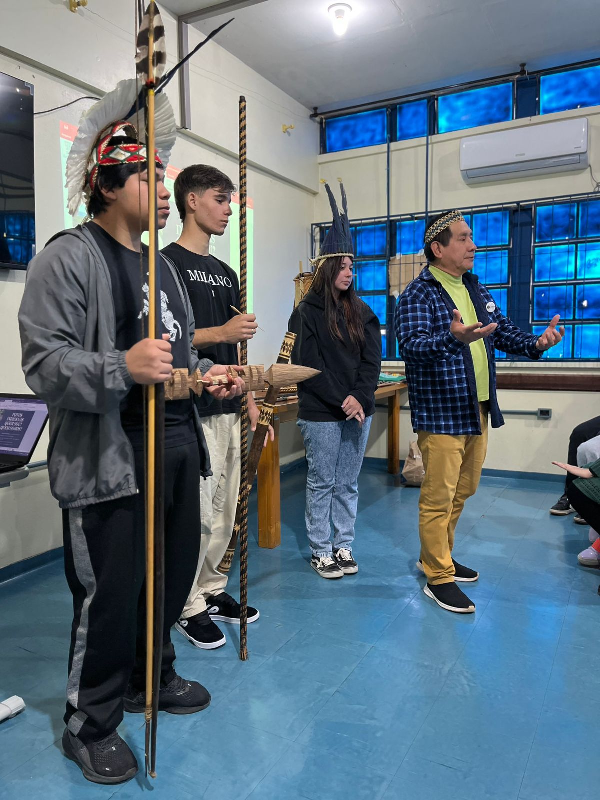 Durante sua fala, Valdélio compartilhou experiências com os participantes, trouxe informações, curiosidades e fez uma exposição explicada de artefatos indígenas, despertando o interesse dos estudantes. Esta atividade teve como objetivo principal reforçar a importância da valorização, da preservação e do respeito às culturas, línguas, tradições e direitos dos povos originários em todo o mundo."