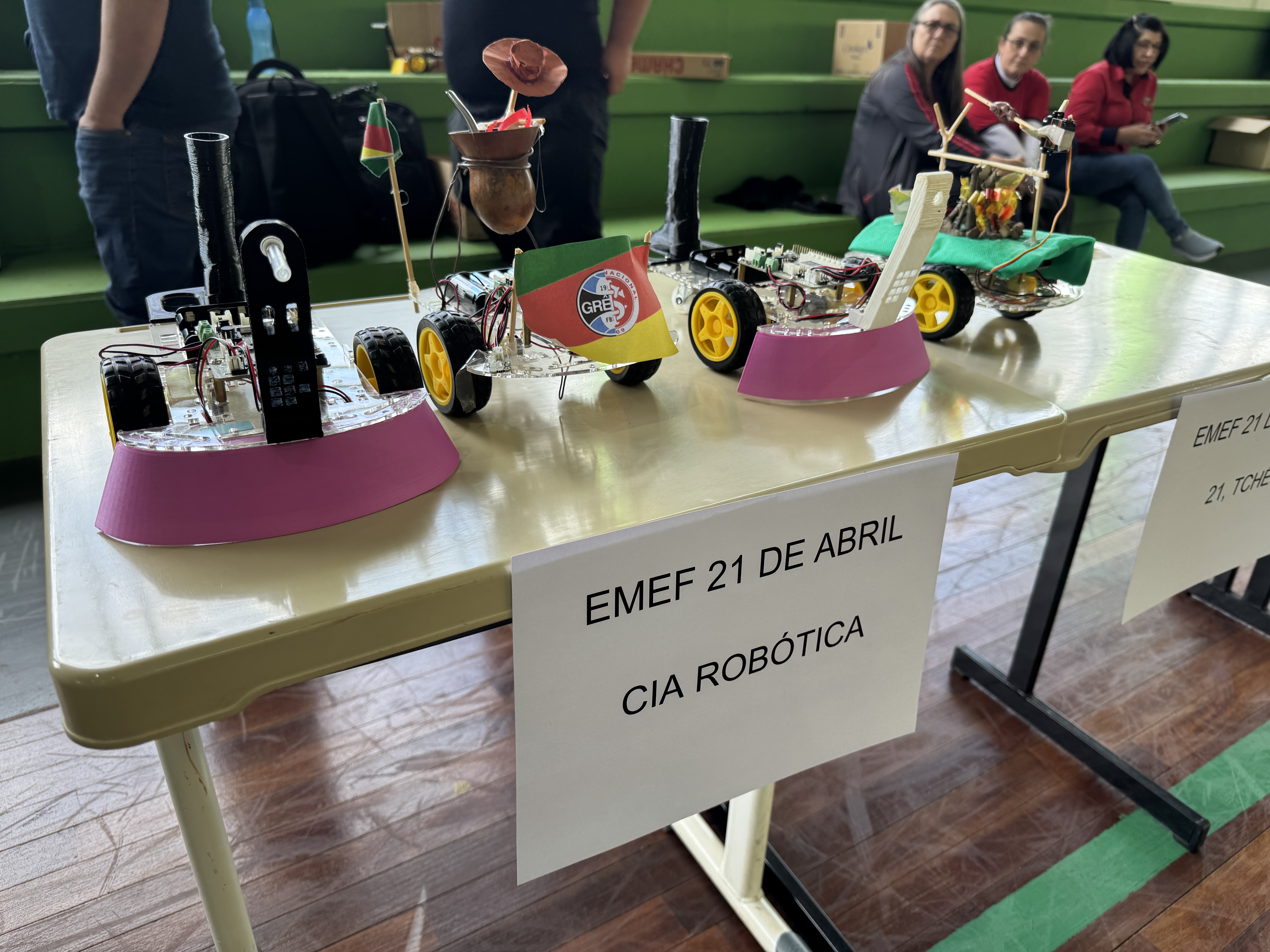 “Levamos uma proposta que despertou curiosidade do público pela disposição dos elementos visuais aliados ao uso da tecnologia no controle dos carrinhos de forma lúdica e interativa”, pontuou Gláucio. Nesse sentido, o projeto incorporou, durante o evento, a sugestão de uma das visitantes do estande. A partir da identificação de um carrinho como sendo “maragato” e outro como “chimango”, a equipe executora do projeto adicionou a identificação de “lenços farroupilhas”, nas cores vermelho e branco, aos carrinhos, contextualizando essa disputa histórica para quem interagia com o projeto.