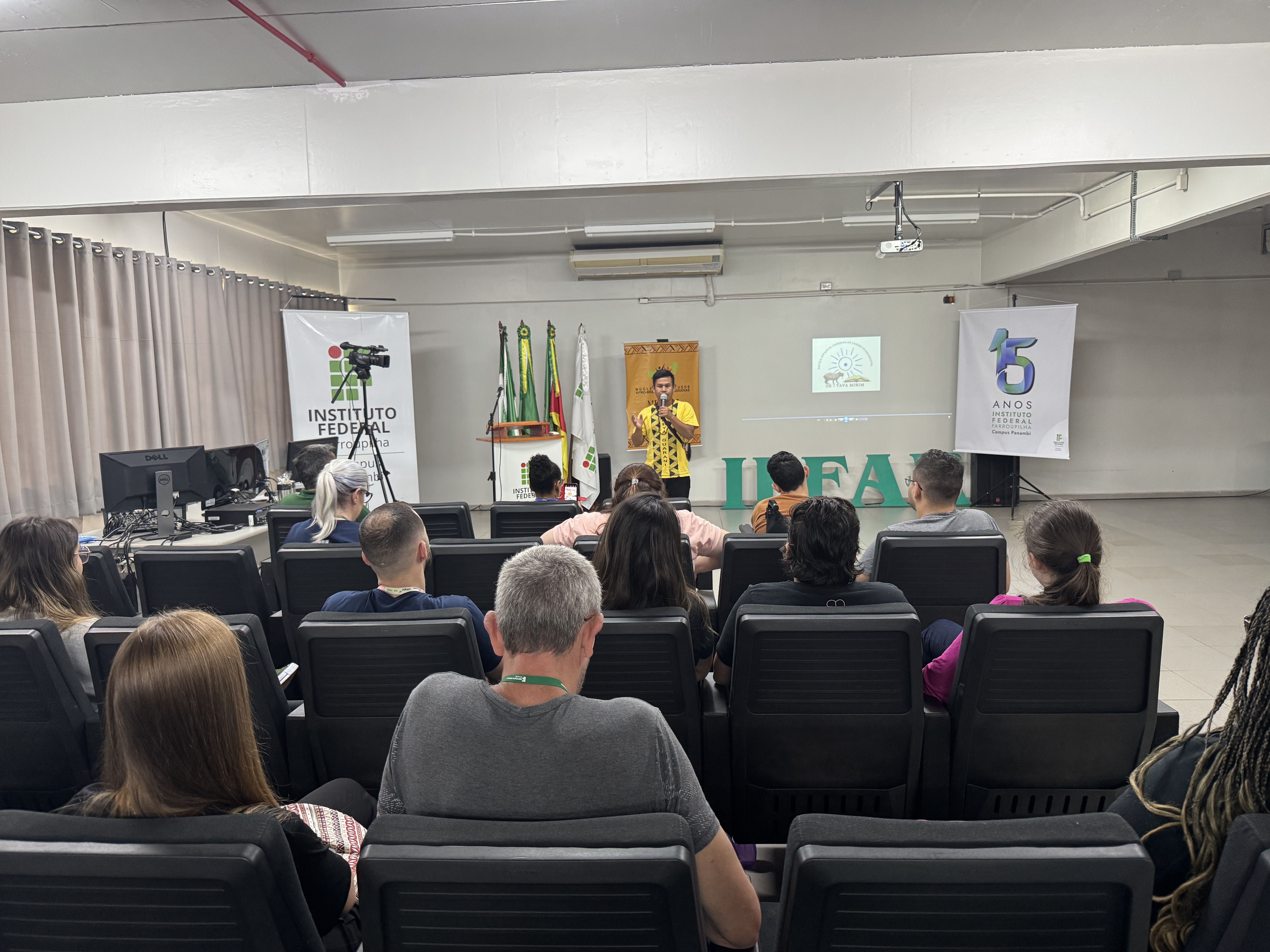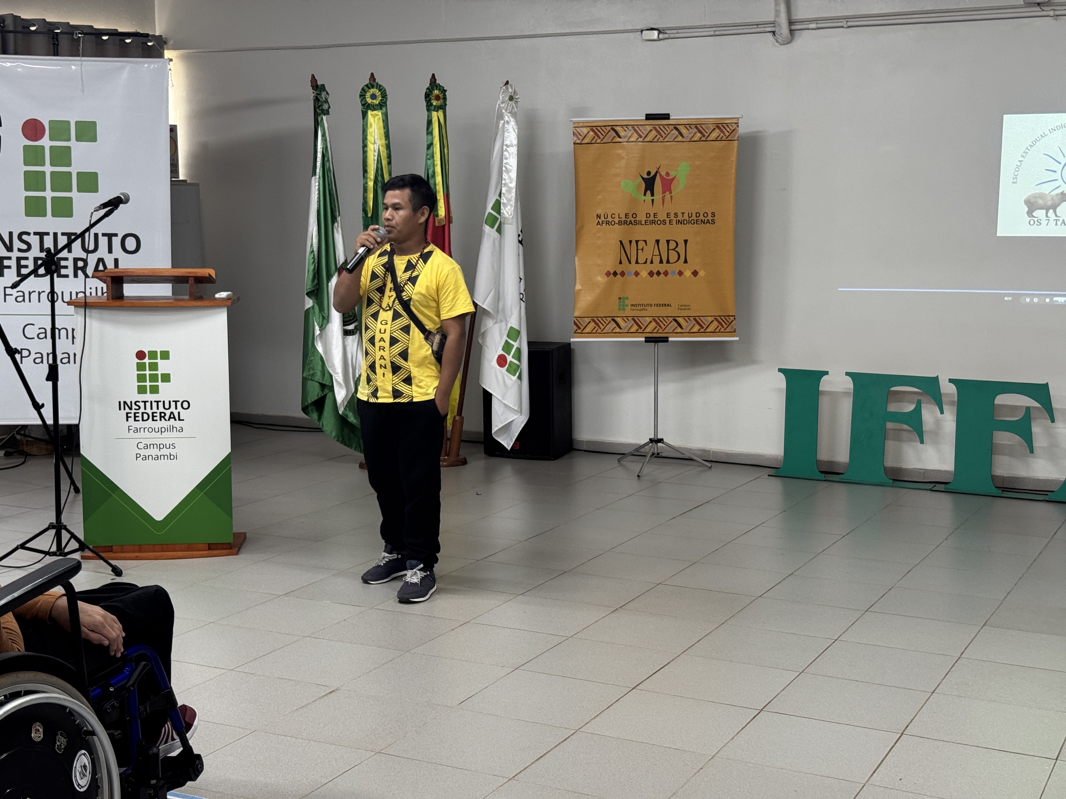 Na tarde de ontem, quarta-feira, 23 de abril, o Núcleo de Estudos Afro-brasileiros e Indígenas (NEABI) do IFFar – Campus Panambi promoveu a palestra “Cultura Mbya Guarani: legados do passado, desafios do presente”, conduzida pela liderança indígena Kuaray Anildo Romeu, da aldeia Tekoa Pyau. O evento, realizado no auditório do campus, reuniu estudantes, servidores e convidados externos em um momento de escuta e reflexão sobre a cultura e os saberes dos povos originários.