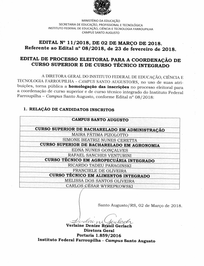 Edital nº 11/2018 - Relação de Candidatos inscritos no Processo Eleitoral para a coordenação de curso superior e de curso técnico integrado