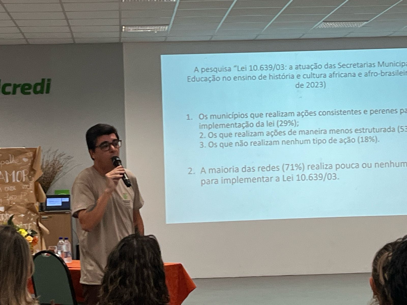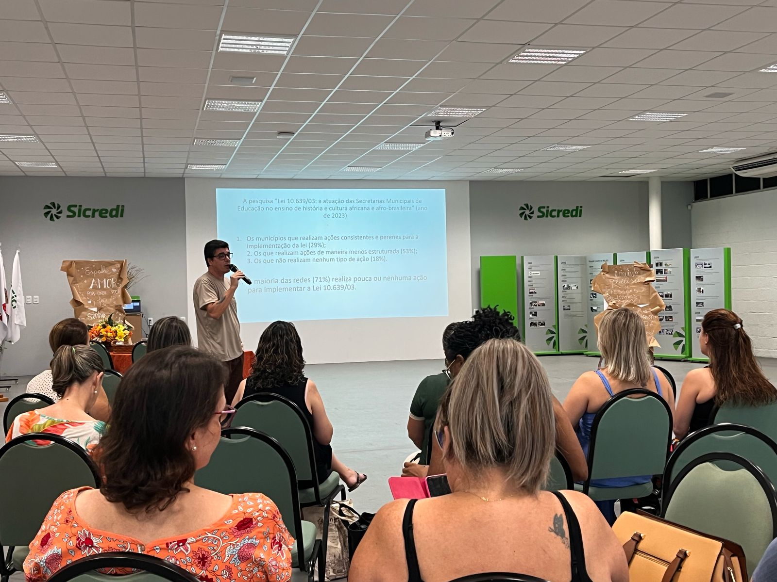 Márcio destacou formas teóricas e práticas para a implementação dessa legislação em sala de aula, reforçando a importância de uma educação inclusiva e antirracista.
