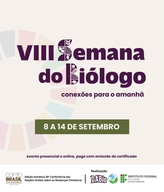 O Instituto Federal Farroupilha – Campus Alegrete, por meio do Diretório Acadêmico e da Coordenação do Curso de Ciências Biológicas, promove de 8 a 14 de setembro a VIII Semana da Biologia (SeBio). O evento, já tradicional na instituição, tem como objetivo ampliar os espaços de diálogo e reflexão sobre diferentes campos do conhecimento em Ciências Biológicas, com foco especial em temas que não são aprofundados na matriz curricular do curso.