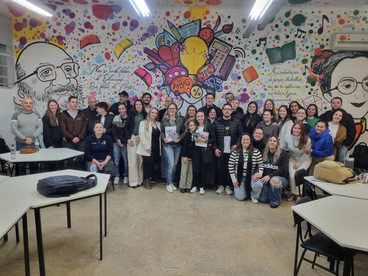 Durante o encontro, a professora Regina Meneguzzi destacou os principais desafios e dificuldades relacionadas à inclusão nas escolas de educação básica, apresentando também os serviços oferecidos pela APAE. Ela compartilhou experiências, orientações e estratégias que podem auxiliar professores e futuros docentes na mediação dos processos de ensino e aprendizagem em contextos inclusivos.