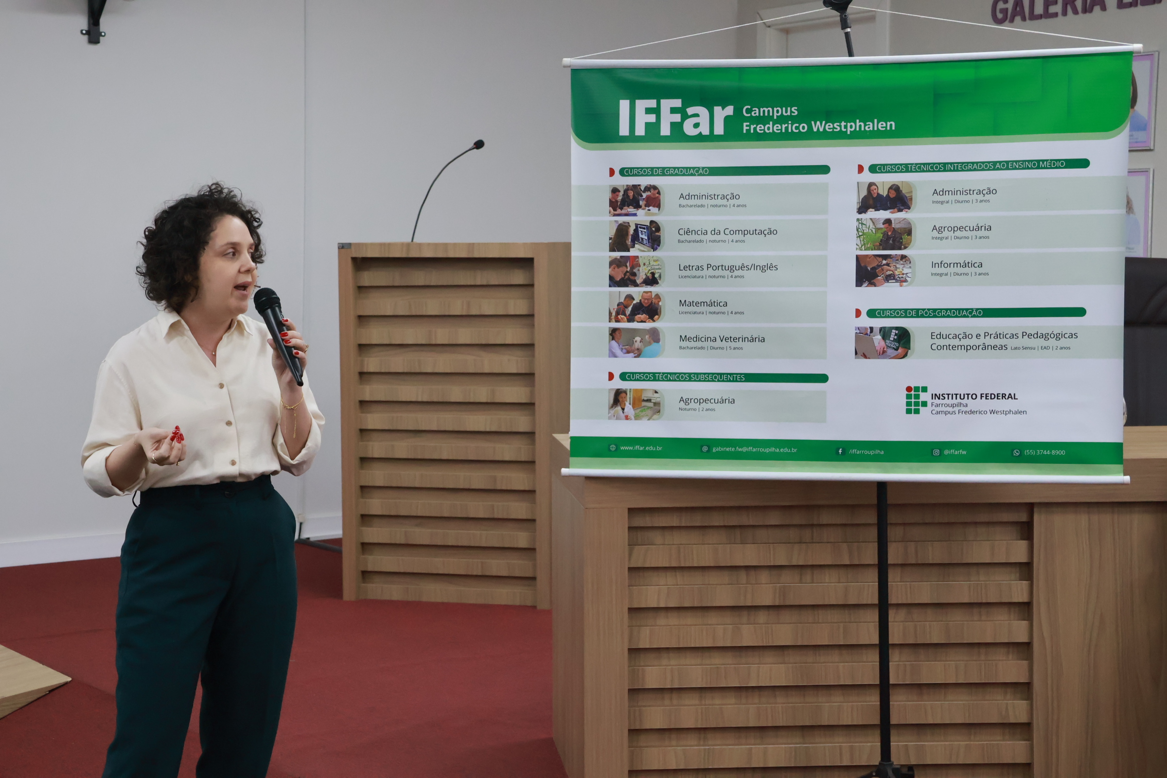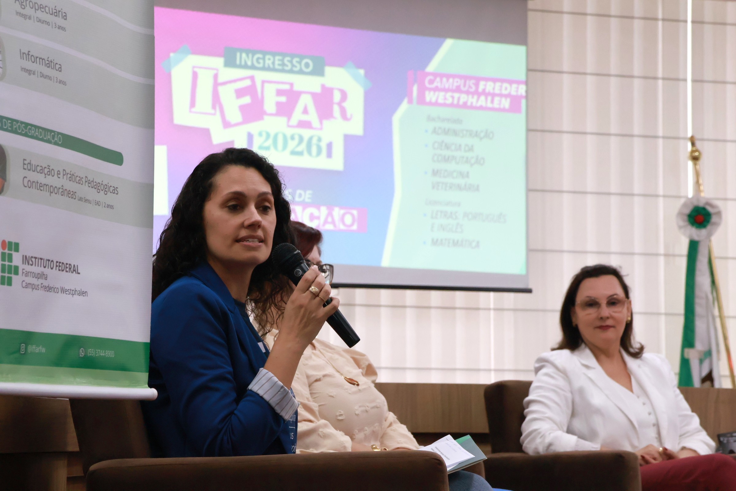 A diretora-geral Silvana Pedrozo ressaltou as potencialidades do campus para atender às demandas educacionais e de formação profissional, bem como os impactos sociais, econômicos e culturais gerados pela presença da instituição no município. Já a diretora Maíra Giovenardi apresentou os cursos ofertados pelo IFFar/FW, que abrangem desde o Ensino Médio Integrado até a Pós-Graduação, destacando as oportunidades de formação disponíveis à comunidade.