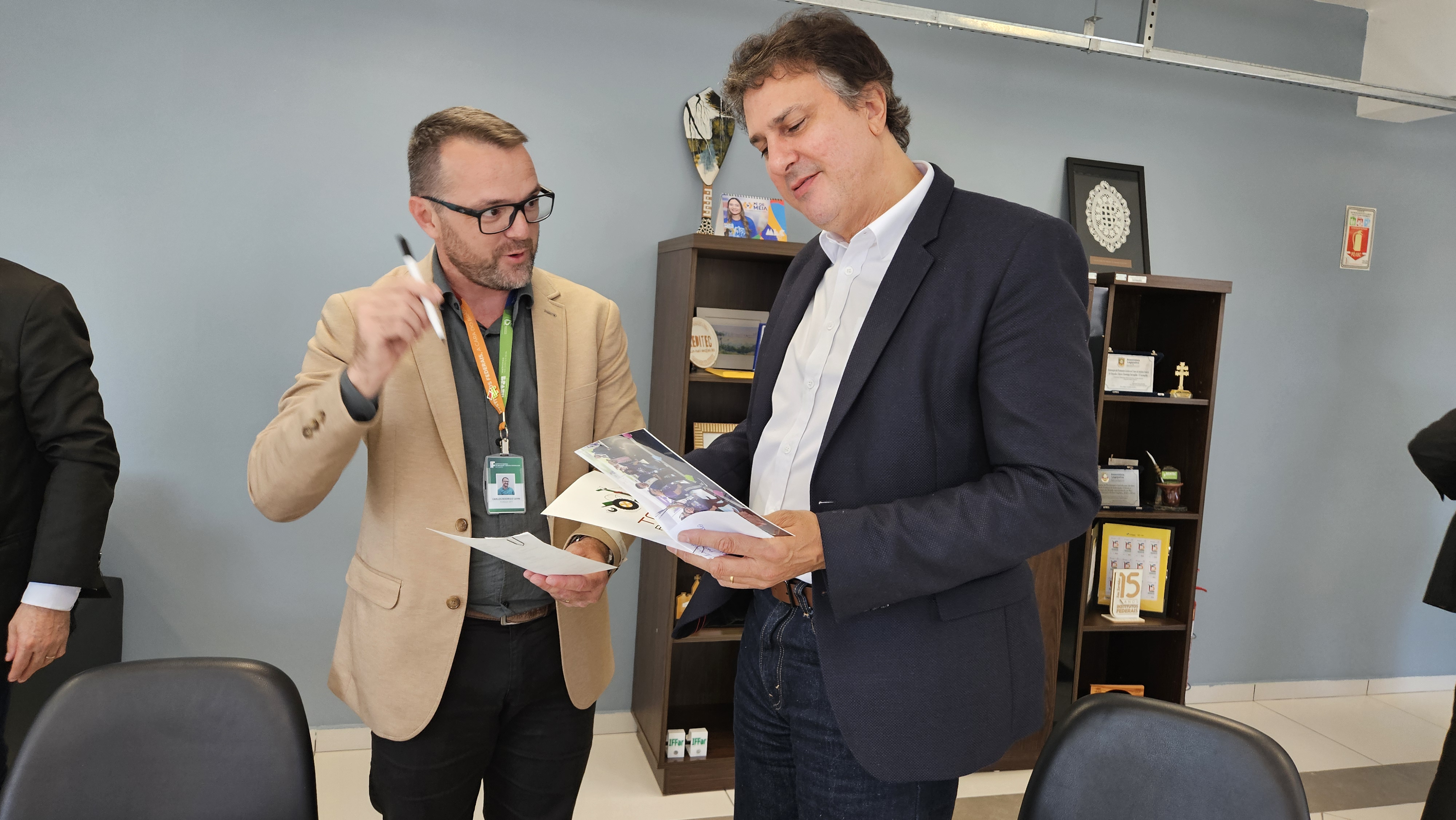 Nesta quinta-feira (21), a reitora do IFFar, professora Nídia Heringer, recebeu em seu gabinete o ministro da Educação, Camilo Santana. O ministro esteve em Santa Maria para a cerimônia que marcou a recondução da reitora ao cargo para a gestão 2025-2029. O evento, realizado no Salão Nobre do Avenida Tênis Clube, reuniu autoridades, servidores e cerca de 400 estudantes de todos os campi do IFFar.