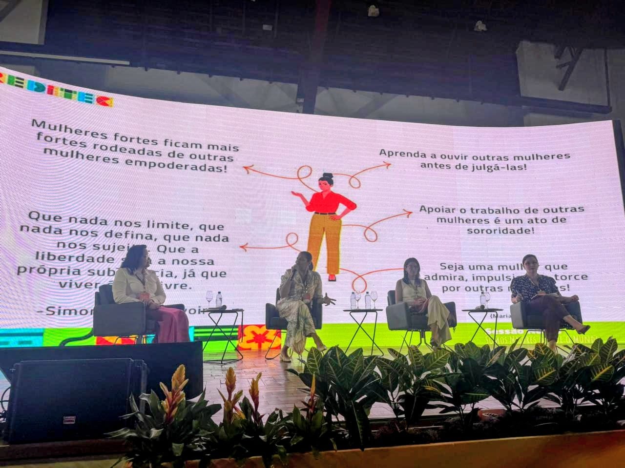 No palco, as reitoras Elaine Cassiano (IFMS), anfitriã do evento, Ana Paula Giraux (Colégio Pedro II), Ana Paula Palheta (IFPA) e Nídia Heringer (IFFarroupilha) falaram sobre os desafios que enfrentam como líderes.
