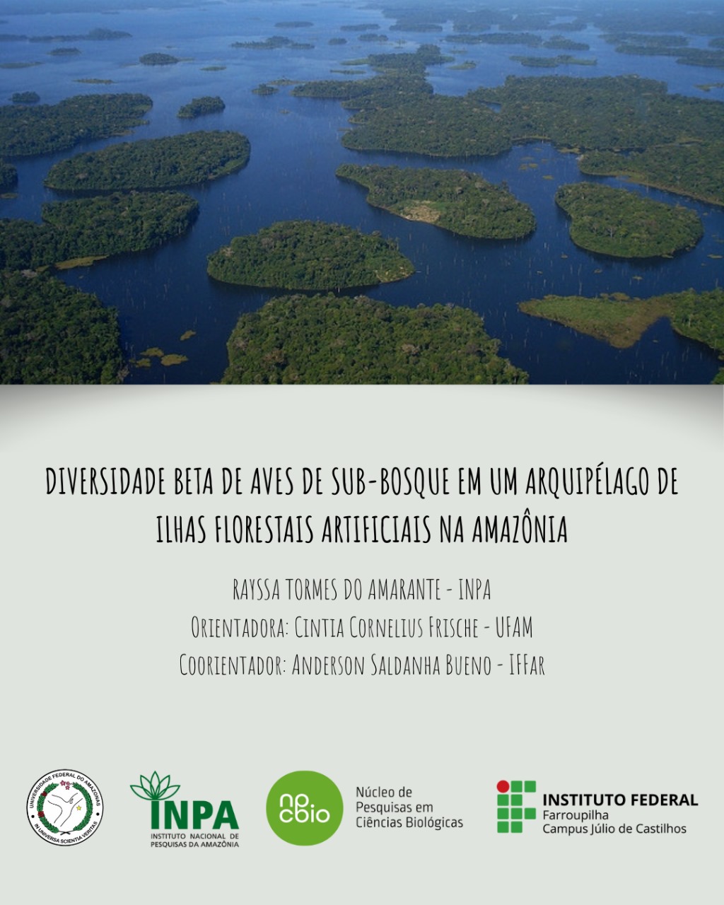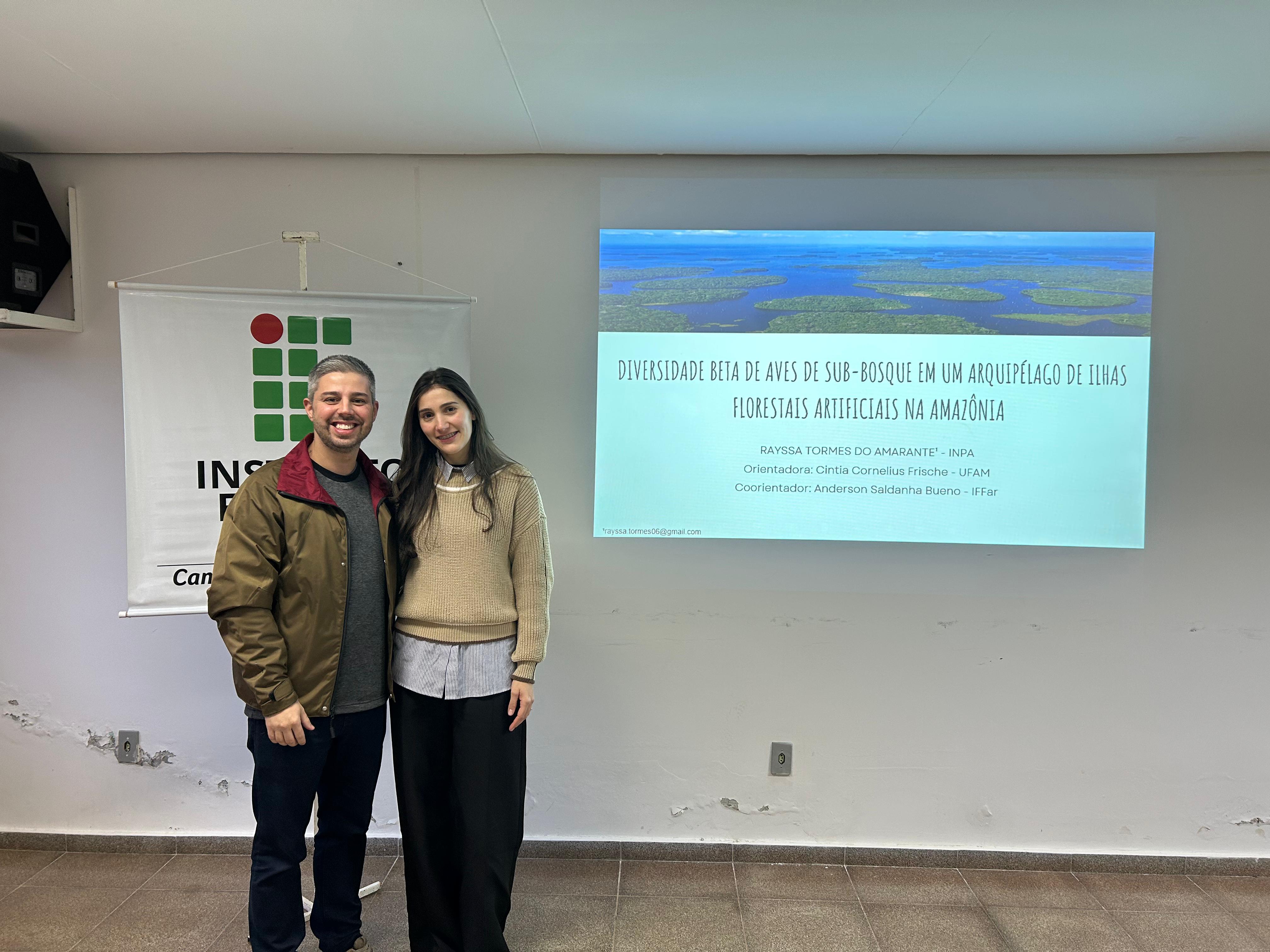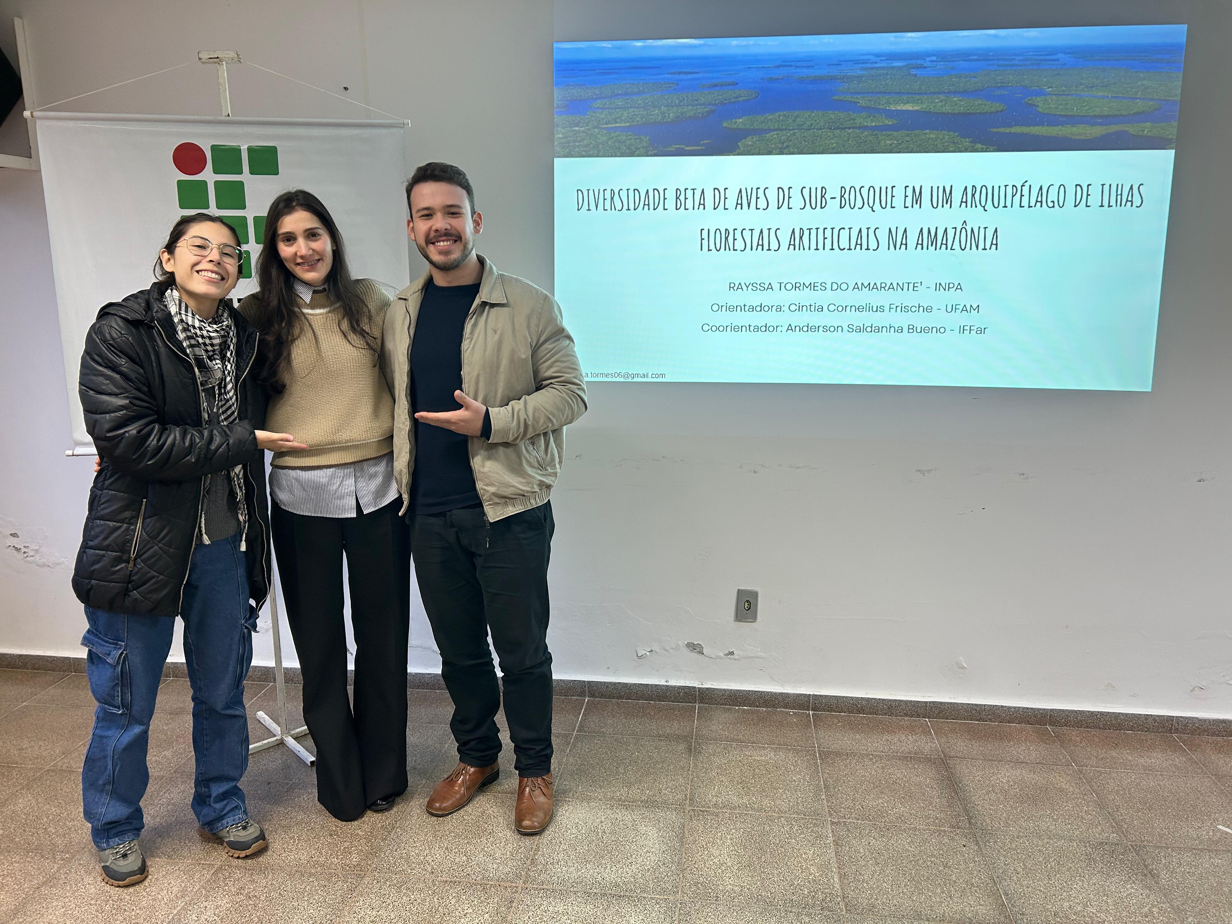 Ao longo da pesquisa, Rayssa registrou mais de 1.600 aves de sub-bosque em 32 ilhas artificiais e 5 locais em floresta contínua. Além dela, participaram do trabalho de campo na Amazônia Ivana Cardoso, egressa do IFFar-JC, e Felipe de Brum Fernandes, discente da Licenciatura em Ciências Biológicas. O estudo, orientado pela Dra. Cíntia Cornelius (Universidade Federal do Amazonas – UFAM) e coorientado pelo Dr. Anderson Saldanha Bueno (IFFar JC), investigou a influência da área e do isolamento das ilhas sobre a diversidade beta de espécies e de funções ecológicas dessas aves. A pesquisa contou com parcerias com instituições nacionais e internacionais, envelvendo INPA, UFAM, IFFar e a University of East Anglia (Reino Unido), além de apoio financeiro da British Ecological Society (Sociedade Ecológica Britânica).