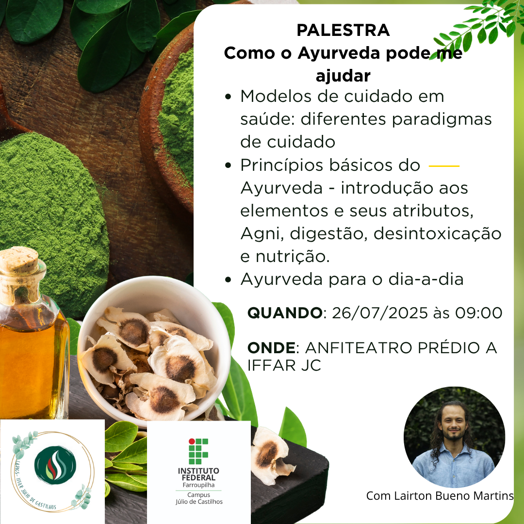 O Instituto Federal Farroupilha - Campus Júlio de Castilhos, por meio do LAPICS/IFFar-JC, realizará neste mês de julho uma programação especial dedicada à saúde integral e à Medicina Ayurvédica, ministrada pelo terapeuta Lairton Bueno Martins. O evento acontecerá nos dias 26 e 27 de julho de 2025, de forma presencial, no campus de Júlio de Castilhos, no Rio Grande do Sul.