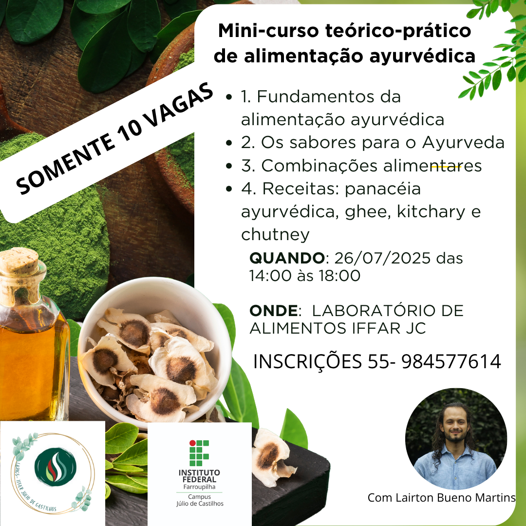 No mesmo dia, haverá também um mini-curso teórico-prático de alimentação ayurvédica, com foco na aplicação dos conhecimentos na rotina diária. O minicurso será realizado no sábado (26), das 14h às 18h, e também no domingo (27), das 09h às 14h, com limite de 10 vagas por dia. Entre os tópicos abordados estão os fundamentos da alimentação ayurvédica, os sabores essenciais, combinações alimentares e receitas tradicionais como panacéia ayurvédica, ghee, kitchary e chutney.