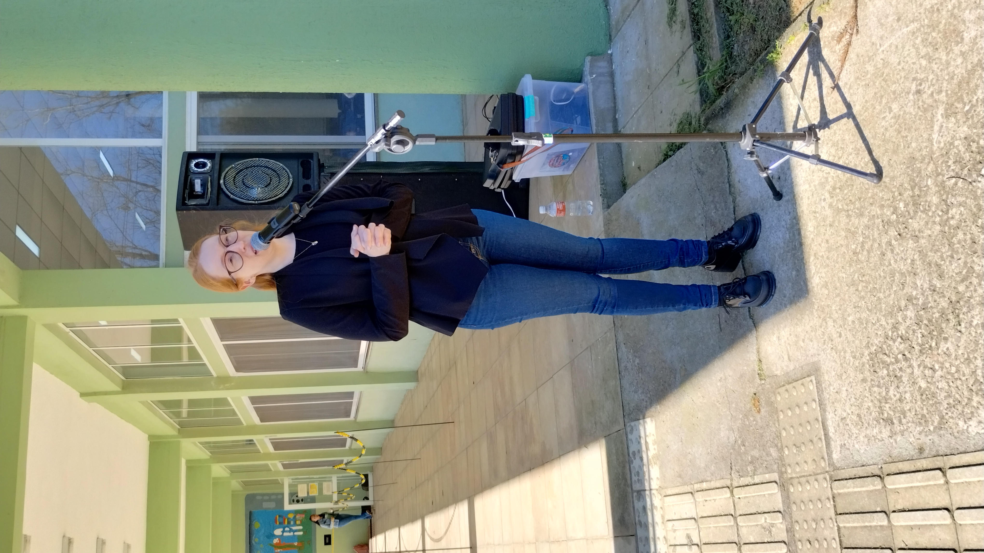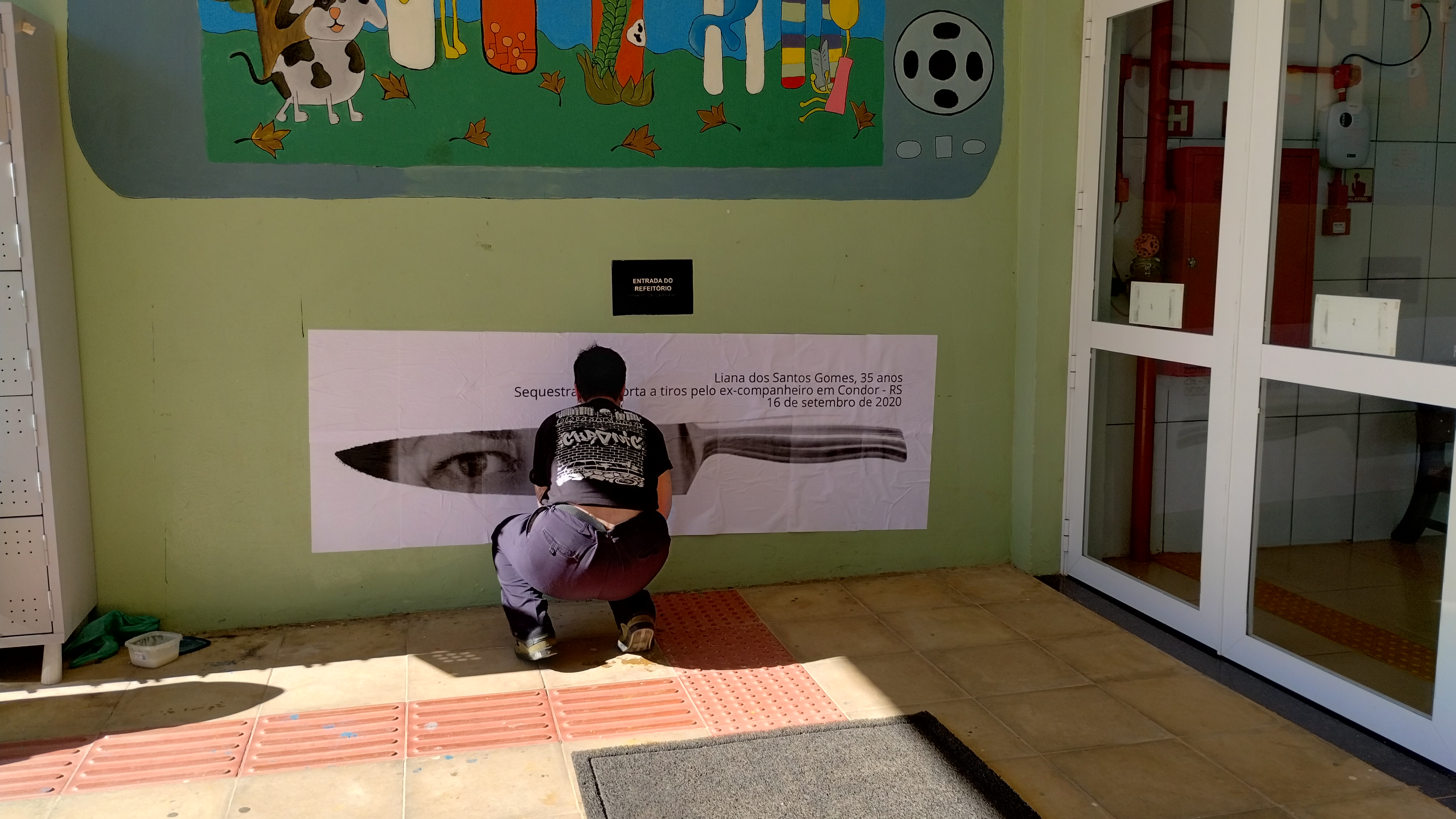 Após as falas, o banco foi oficialmente descerrado pela professora Juliana Mezomo Cantarelli e pela estudante Joelma Cezimbra. Encerrando a cerimônia, aconteceu a intervenção artística “Incisivas”, conduzida pela artista visual e pesquisadora Stéfani Agostini, doutoranda e mestra em Artes Visuais pela UFSM. Sua performance poética abordou memórias e resistências femininas, traçando um paralelo entre o corpo, o silêncio e a luta contra a violência no ambiente doméstico.
