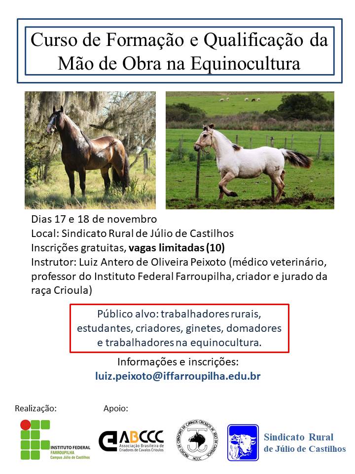 Entre os dias 17 e 18 de novembro no Sindicato Rural de Júlio de Castilhos, o professor Luiz Antero de Oliveira Peixoto, irá ministrar Curso de Formação e Qualificação da Mão de Obra na Equinocultura. O Curso é destinado a trabalhadores rurais, estudantes, criadores, ginetes, domadores e trabalhadores na equinocultura.