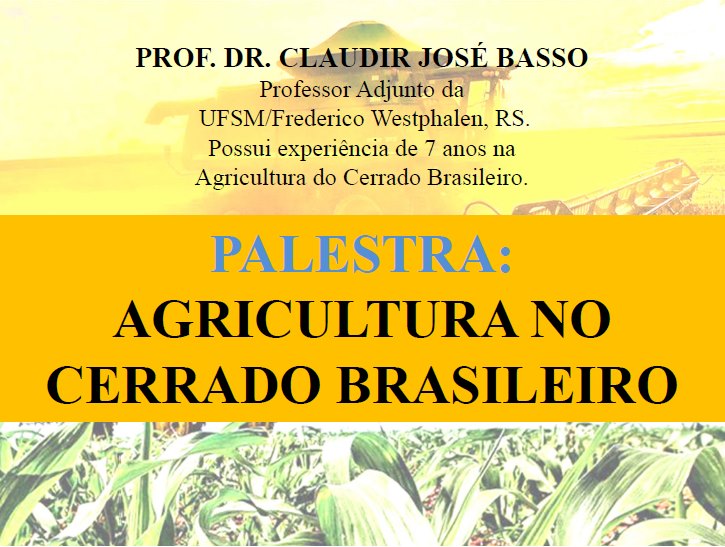 19h30min - 21h - Palestra com Eng. Agrônomo, Professor Dr. Claudir Basso (UFSM-FW), sobre Agricultura no Cerrado Brasileiro.
