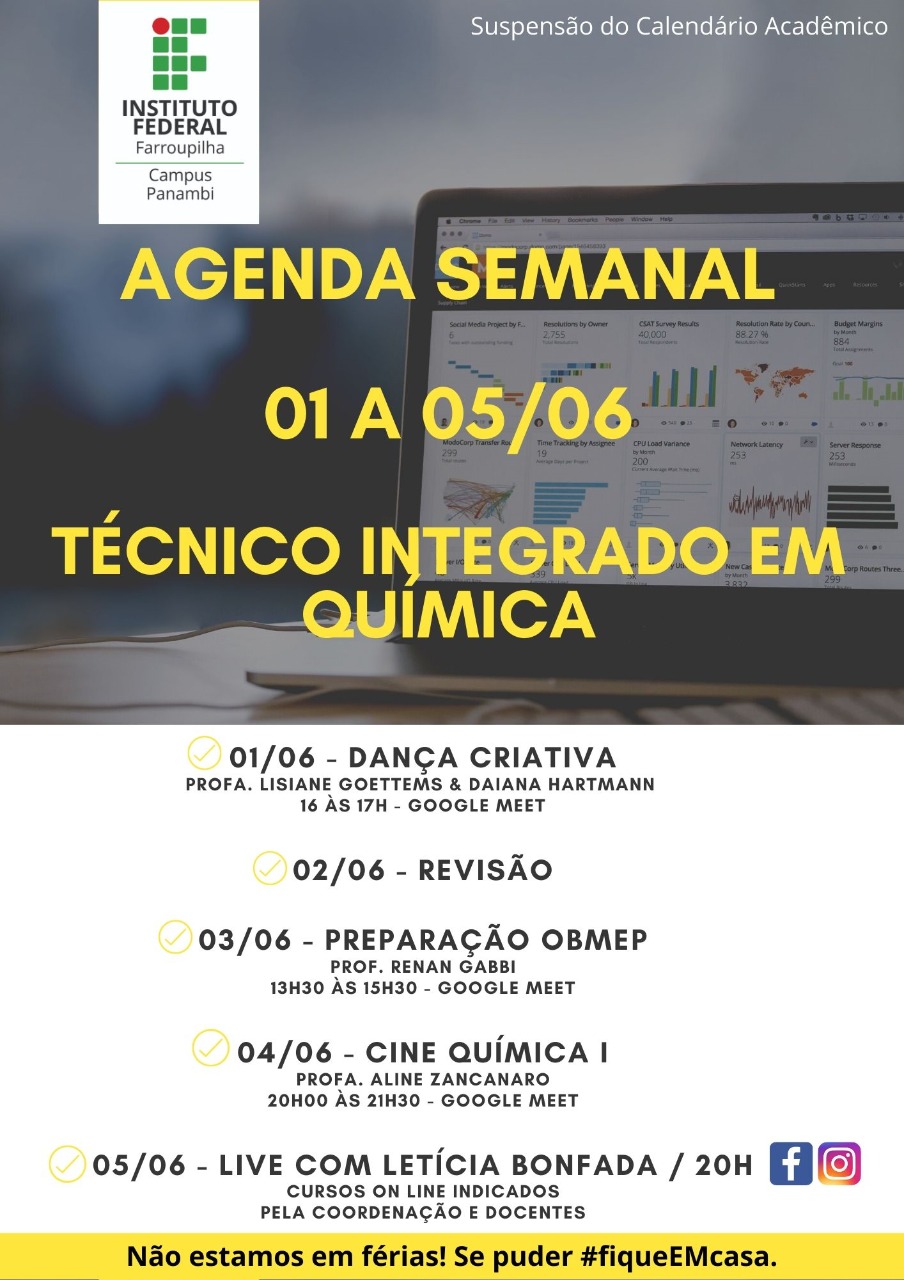 A cada semana, uma agenda contendo as ações que serão desenvolvidas por cada curso, será divulgada no portal institucional e nas redes sociais do Campus Panambi.