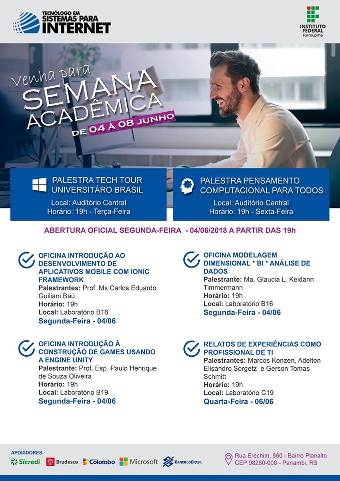 Entre os dias 4 e 8 de junho ocorrerá a Semana Acadêmica do Curso Superior de Tecnologia em Sistemas para Internet do IFFar – Campus Panambi. As inscrições podem ser realizadas com a Comissão Organizadora no momento que antecede cada atividade, a um custo de R$10,00 por noite. As atividades iniciam às 19h.