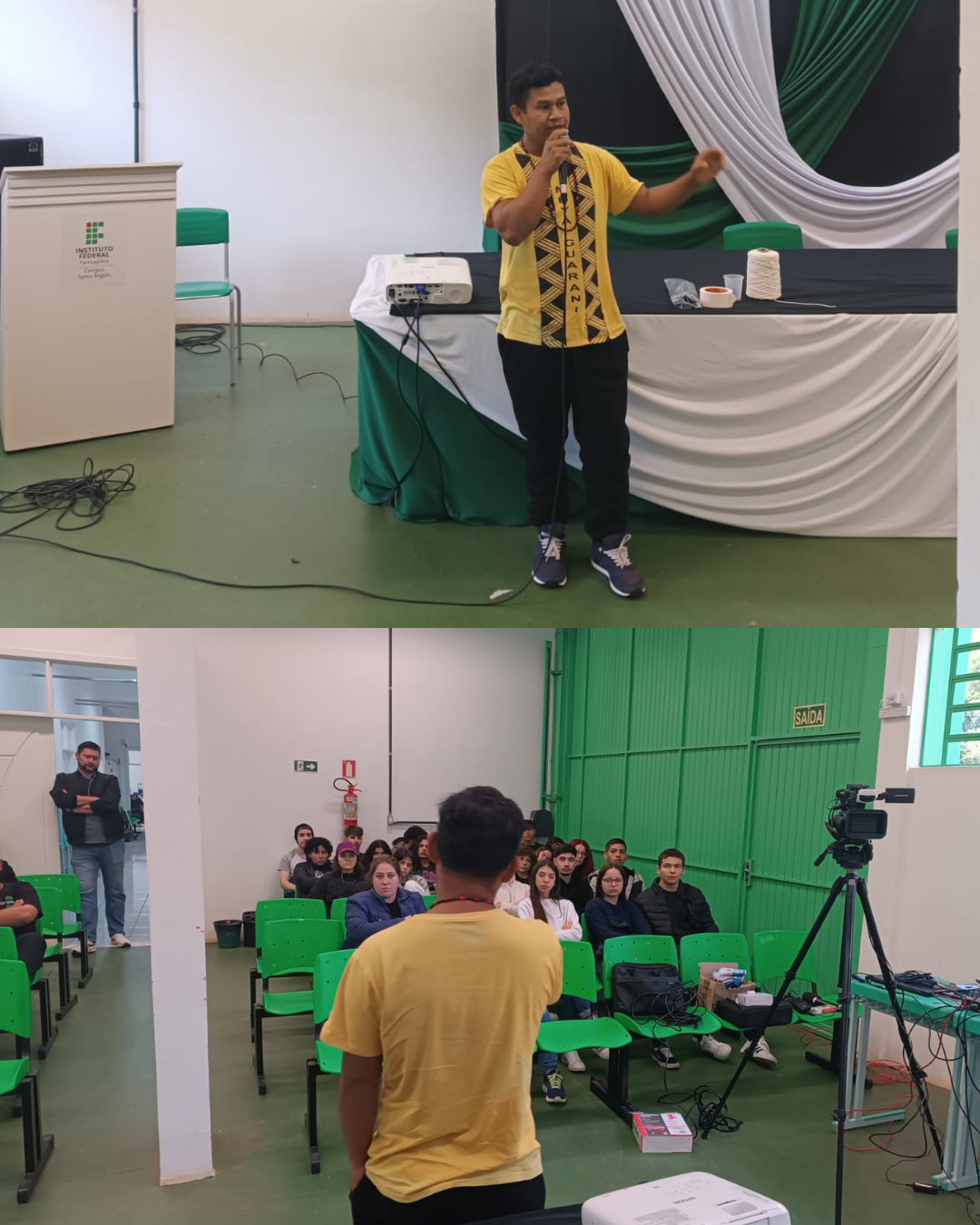 Foram realizados encontros com os alunos do Ensino Médio Integrado, pela parte da manhã, e alunos dos cursos de Pedagogia e Licenciatura em Computação, na parte da noite. As falas foram conduzidas pelo indígena Guarani M’Bya Kuaray Anildo Romeu e mediadas pelo docente de História e presidente do Neabi, Amilcar Guidolim.