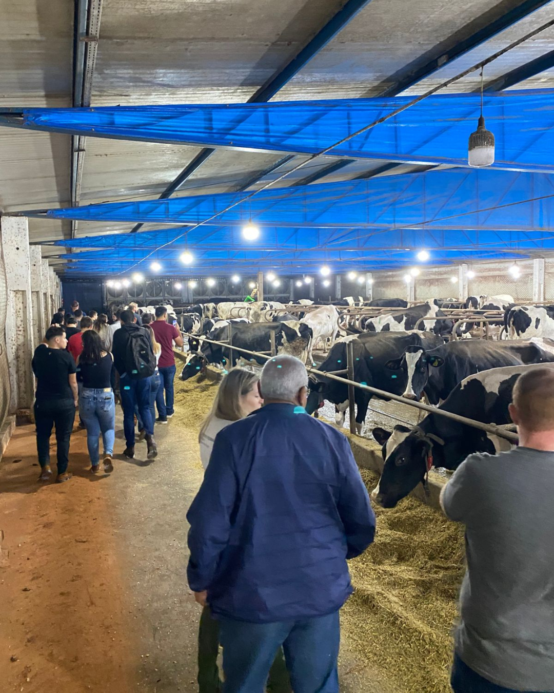 Durante a visita, os estudantes puderam conhecer de perto a estrutura da fazenda, os sistemas de gestão aplicados à produção leiteira e os desafios e benefícios da adoção de tecnologias no campo. A turma foi recepcionada pelo senhor Fábio Cassel, que compartilhou com os alunos sua experiência na administração da propriedade e nos processos de inovação.