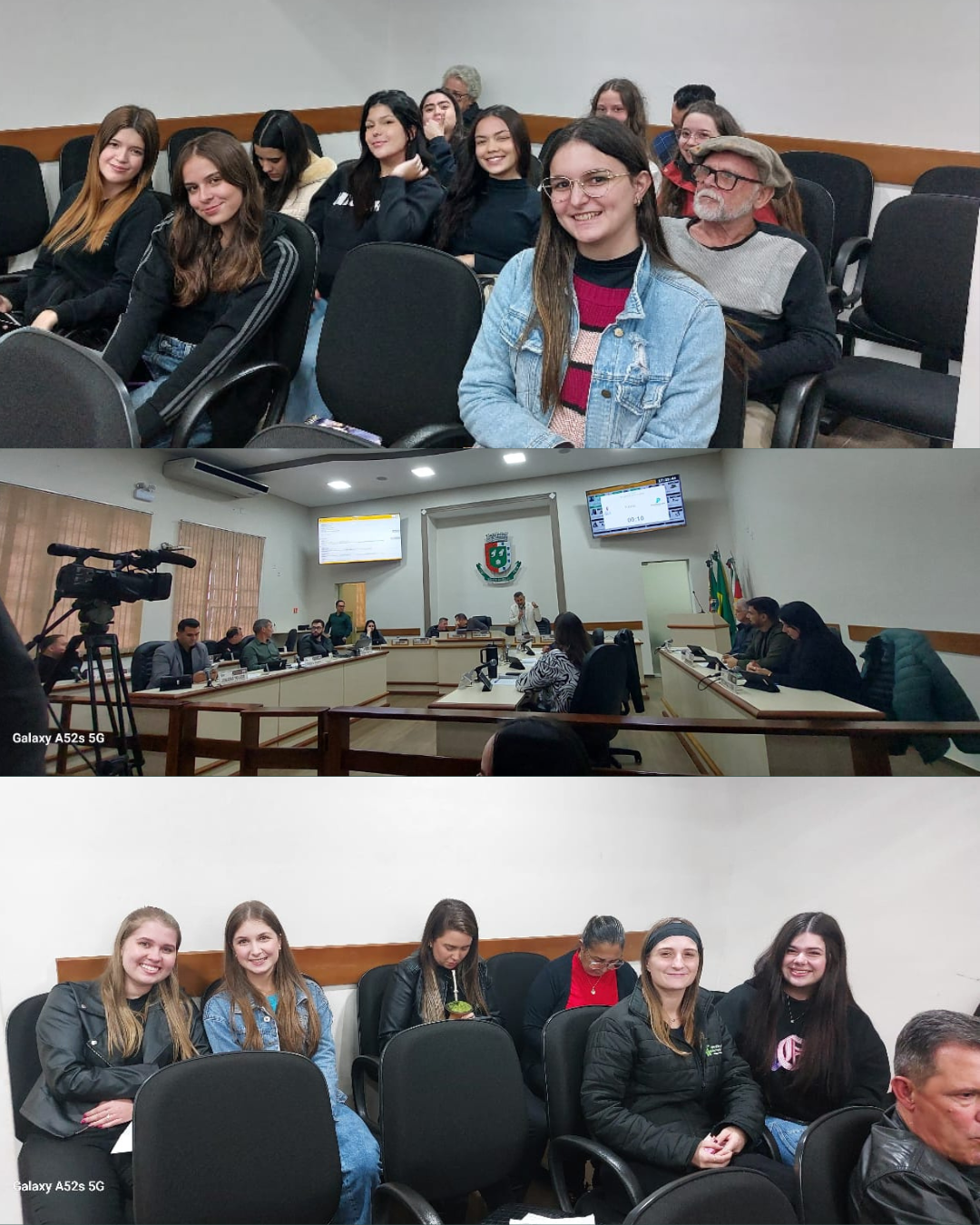 Estudantes do Curso Técnico em Administração, turmas dos terceiros anos, participaram de Sessão Legislativa, no dia 26/05/2025, a partir das 17h30min, na sede da Câmara de Vereadores, no município de Santo Ângelo/RS.