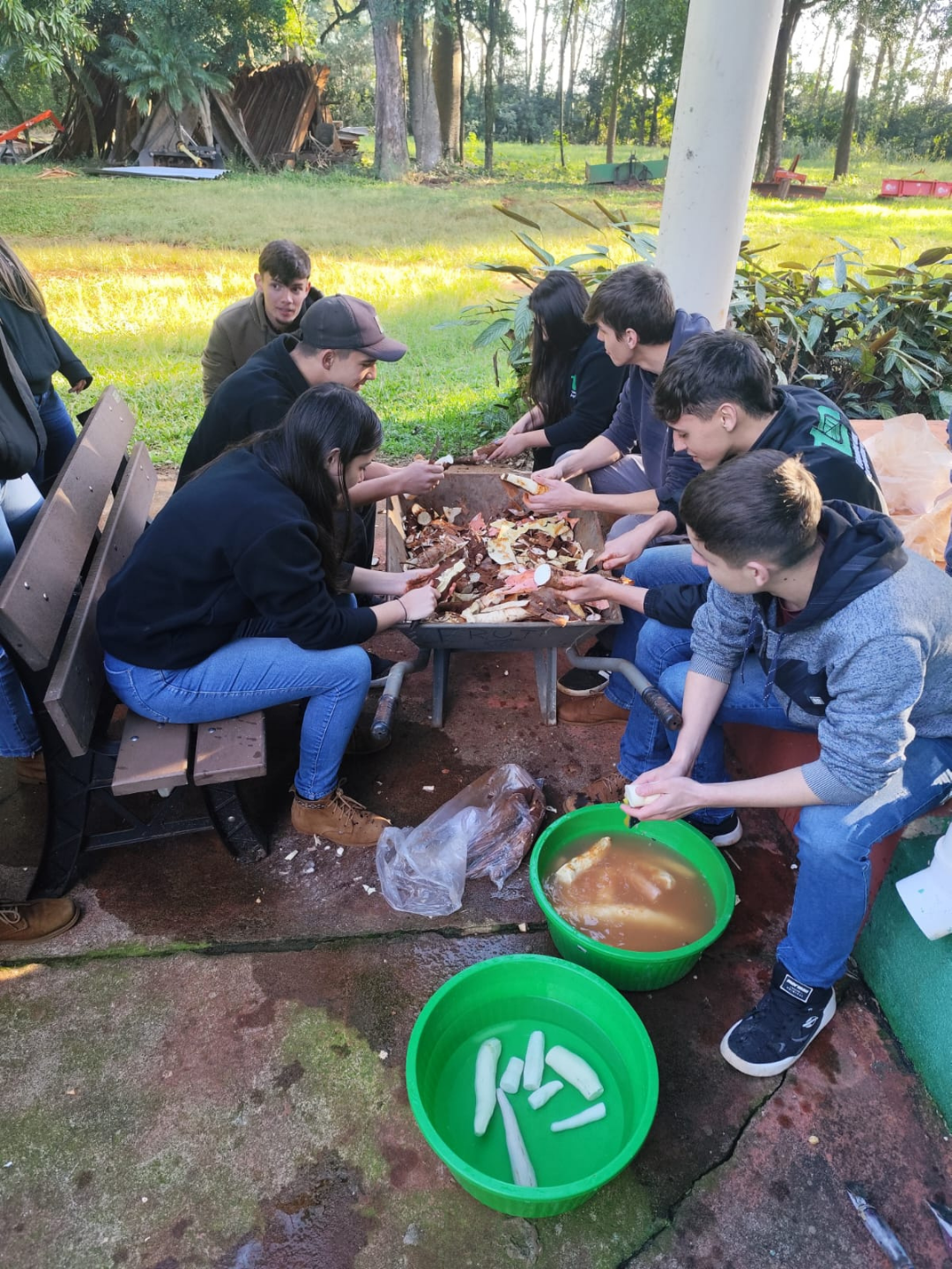 E com as raízes colhidas, a turma AGR31 realizou o processamento mínimo da mandioca (descascamento, lavagem, embalagem e congelamento). Também prepararam um delicioso ensopado e um bolo de mandioca, feitos com diferentes variedades — com direito a degustação e aprovação dos estudantes!