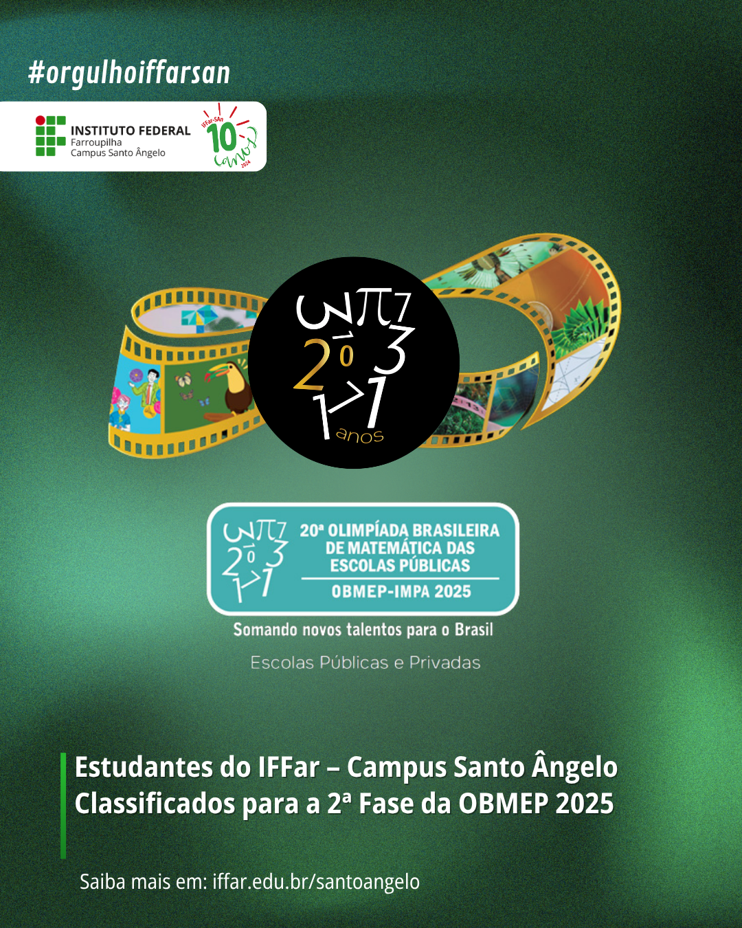 Dezenove estudantes do Instituto Federal Farroupilha – Campus Santo Ângelo foram classificados para a segunda fase da 20ª Olimpíada Brasileira de Matemática das Escolas Públicas (OBMEP). Eles representarão a instituição na prova, que acontecerá em 25 de outubro de 2025, de acordo com o calendário oficial da competição.