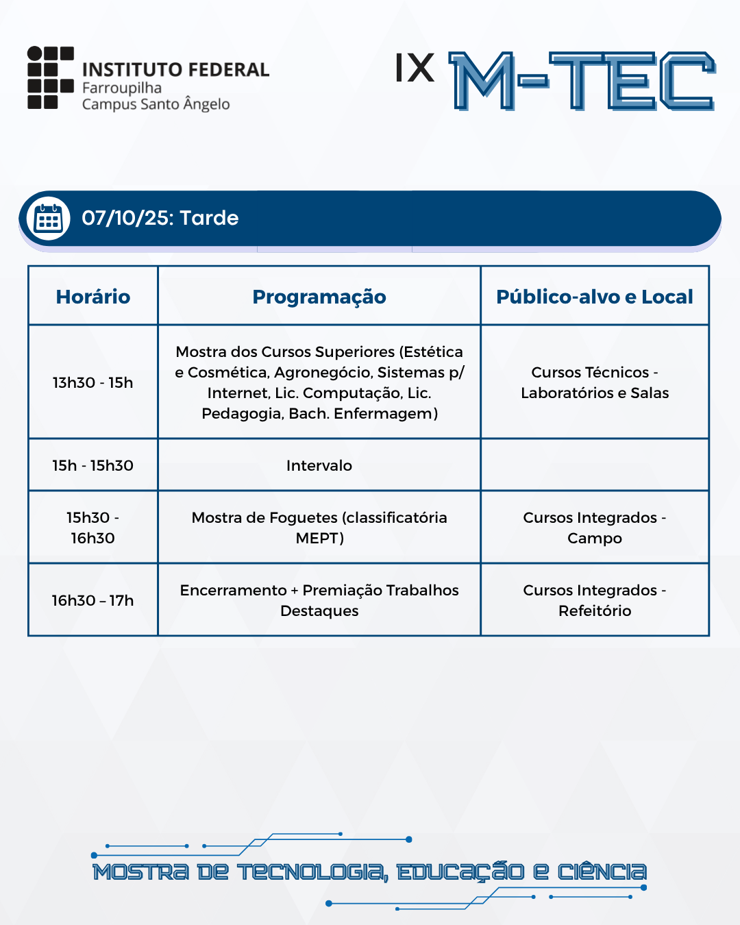 Tarde de Eventos Paralelos: A tarde contará com eventos paralelos, incluindo o Bye Bye Boss e a Mostra de Foguetes (fases classificatórias para a MPET). Além disso, teremos a Mostra dos Cursos Superiores, uma excelente oportunidade para os alunos dos cursos técnicos conhecerem os seis cursos de graduação oferecidos pelo campus.