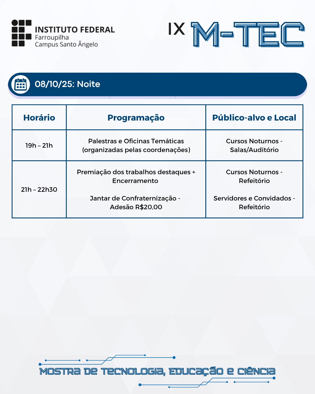 Convidamos os alunos dos cursos noturnos a participar do jantar de encerramento (por adesão até o dia 07/10/2025).