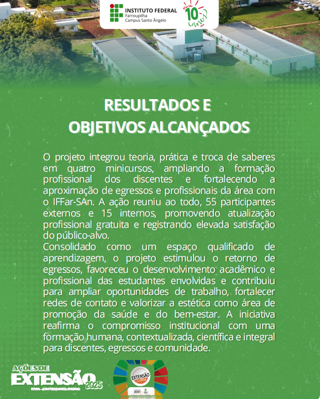 Coordenada pela Prof.ª Ma. Jéssica dos Reis Lohmann Monteiro, a ação contou com a participação ativa da monitora bolsista Letieli Coleto e de estudantes do Curso Superior de Tecnologia em Estética e Cosmética. Com avaliações altamente positivas, a iniciativa reforçou a qualidade formativa do Campus, estimulou o retorno de egressos, ampliou oportunidades de trabalho, fortaleceu redes de contato e valorizou a estética como área de promoção da saúde e bem-estar.