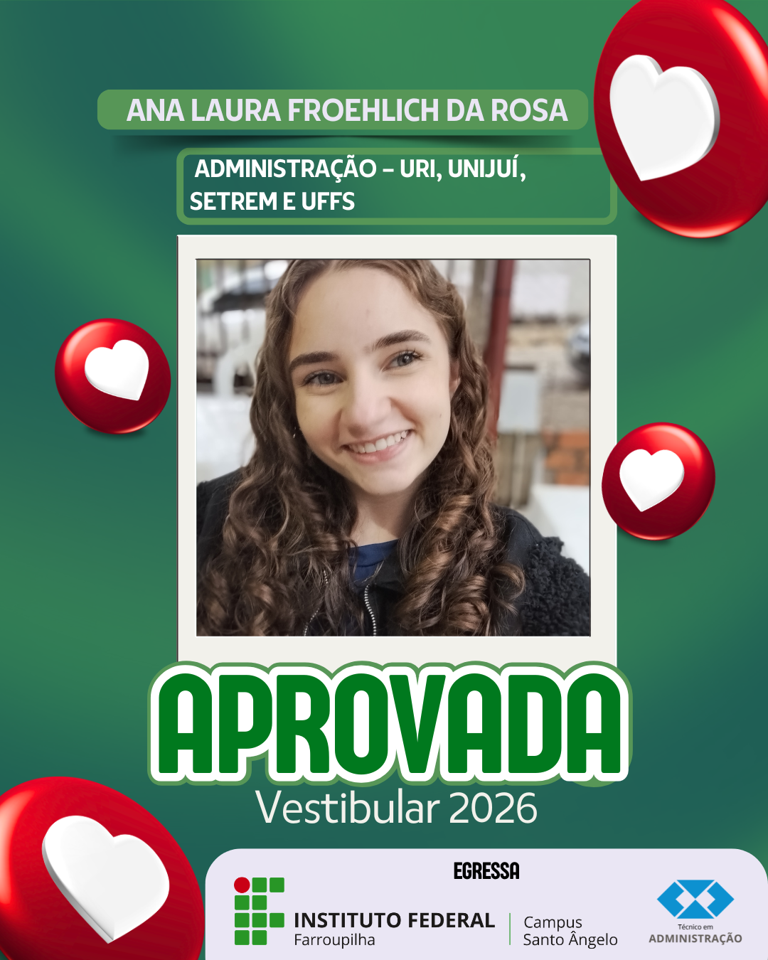 Ana Laura Froehlich da Rosa – Administração – aprovada na Universidade Regional Integrada do Alto Uruguai e das Missões (URI), Universidade Regional do Noroeste do Estado do Rio Grande do Sul (UNIJUÍ), Sociedade Educacional Três de Maio (SETREM) e Universidade Federal da Fronteira Sul (UFFS)