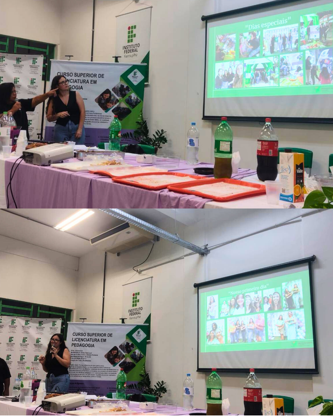 Um momento especial de acolhida foi conduzido pelas acadêmicas veteranas Amanda e Cláudia, que apresentaram uma retrospectiva de sua trajetória no curso durante o ano de 2025. Na ocasião, destacaram a diversidade de ações realizadas, as aprendizagens construídas e a importância do processo de formação inicial para o exercício da docência.