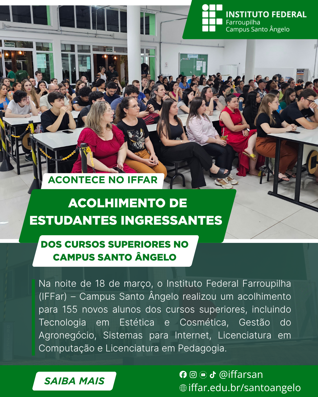 Na noite de 18 de março de 2026, o Instituto Federal Farroupilha (IFFar) – Campus Santo Ângelo promoveu um momento especial de acolhimento aos estudantes ingressantes dos cursos superiores da instituição. Participaram da atividade 155 acadêmicos dos Cursos Superiores de Tecnologia em Estética e Cosmética, Gestão do Agronegócio e Sistemas para Internet, além dos cursos de Licenciatura em Computação e Licenciatura em Pedagogia.