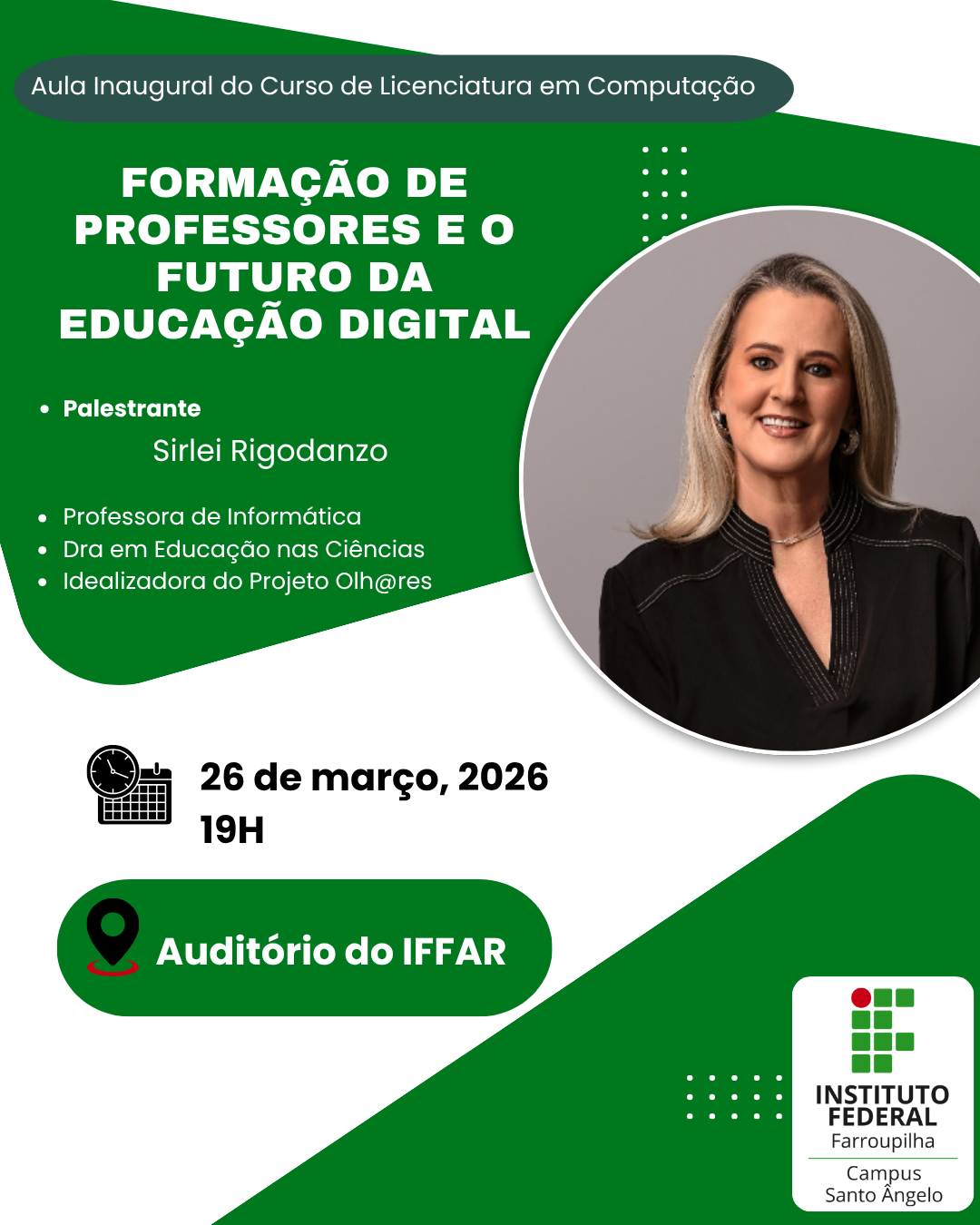 O curso de Licenciatura em Computação do Instituto Federal Farroupilha – Campus Santo Ângelo (IFFar-SAn) realizará, no próximo dia 26 de março, às 19h30, sua aula inaugural, marcando o início do semestre letivo com um momento de reflexão e diálogo sobre temas contemporâneos da educação.