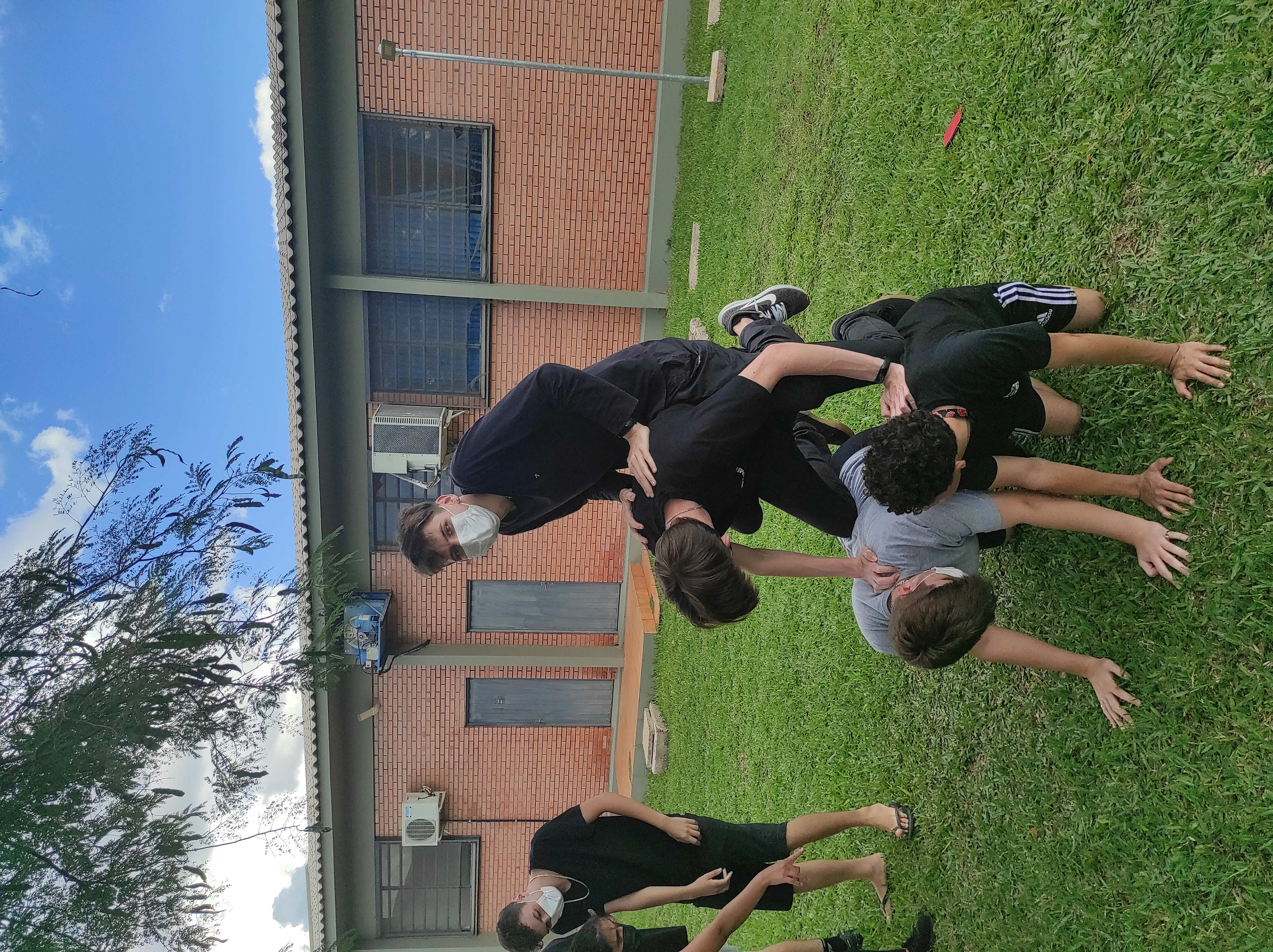 Para finalizar a conversa, os estudantes realizaram no gramado do campus a dinâmica de cooperação que requer confiança e respeito, que consiste em formar um círculo, estando um apoiado no corpo do outro. Segundo a professora Lais, essa atividade ensina os alunos a importância de confiar no colega, pois para permanecer no círculo um depende do outro.