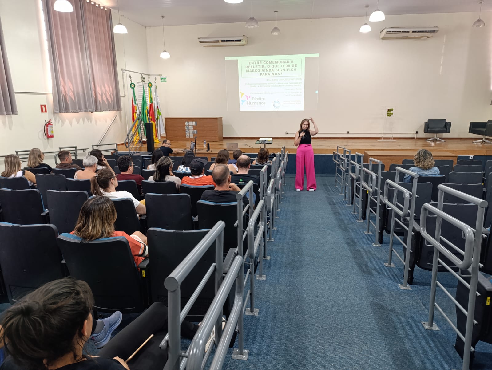Na ocasião, a professora Joice falou sobre o tema “Entre comemorar e refletir: o que o dia 08 de março ainda significa para nós?”, destacando que as desigualdades entre homens e mulheres são construções sociais, reproduzidas ao longo de muitos anos através da cultura, da religião, das instituições, e que dizem como as pessoas devem se comportar, ou seja, quais são os comportamentos adequados ou naturais para cada um dos sexos, e com isso acabam destinando papéis sociais diferenciados para homens e mulheres. Também apresentou propagandas antigas e algumas mais recentes, onde a mulher é retratada de forma pejorativa ou como um objeto do homem, e por fim as principais conquistas obtidas pelas mulheres ao longo dos anos, como o Direito ao Voto, o Direito ao Divórcio, Lei Maria da Penha, entre outras.