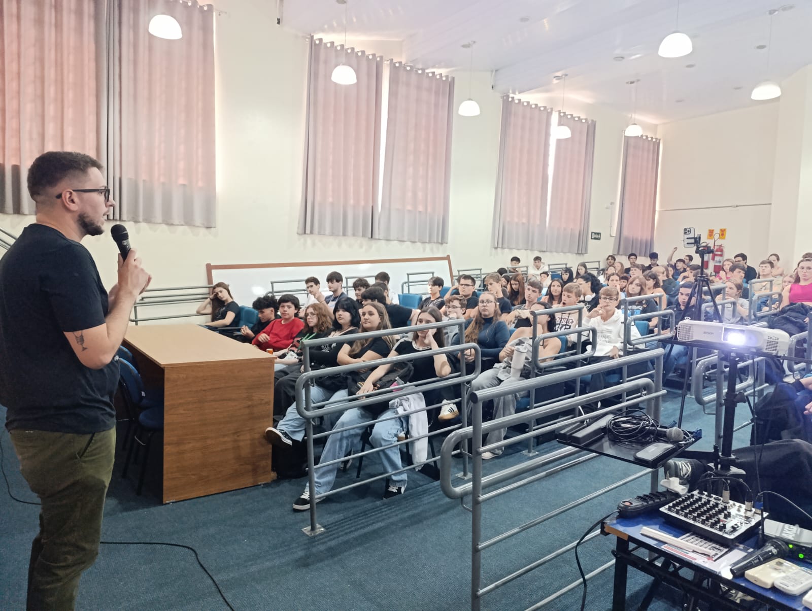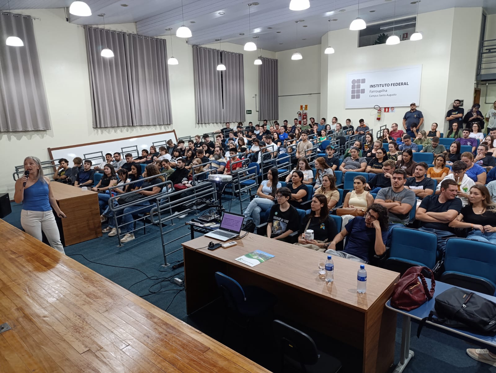 À noite, às 19h, Grazi ministrou a palestra para os acadêmicos dos cursos superiores de Licenciatura em Computação e Licenciatura em Ciências Biológicas e para as turmas de 5º semestre de Administração, Agronomia, Tecnologia em Alimentos e Gestão do Agronegócio.