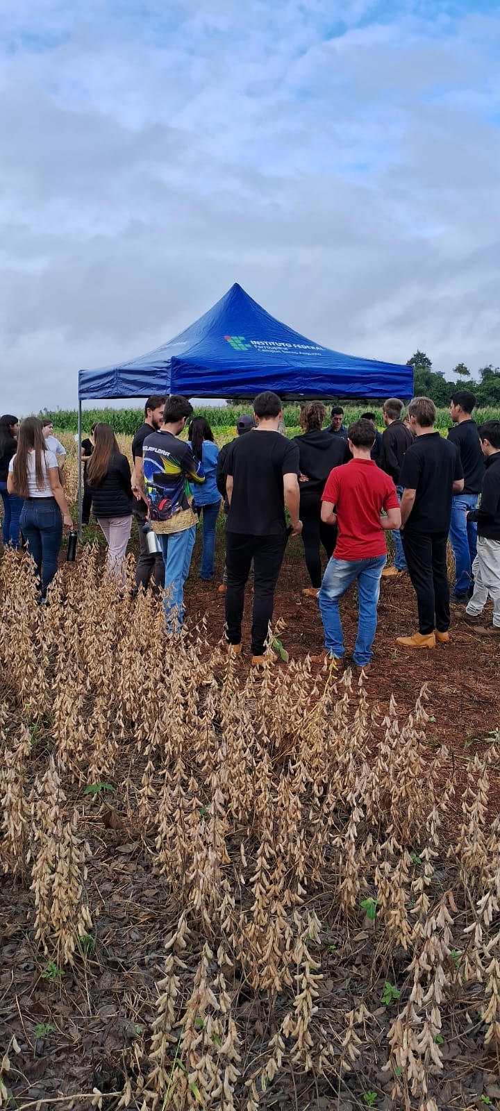 *Estação 5. Cultivares de Soja: Na estação, foram apresentadas as cultivares de soja utilizadas no campo experimental (Portfólio Sementes VanAss, Materiais Fundação Pró-Sementes e Embrapa), ainda foi apresentado o projeto de épocas de semeadura de diferentes cultivares de soja RR da Embrapa. Foi possível identificar as características de desenvolvimento das cultivares, que atualmente se encontram na etapa de pré-colheita.