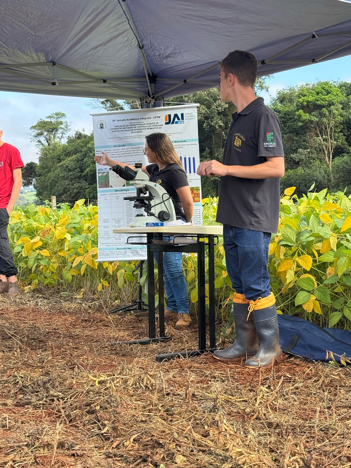 *Estação 3. Manejo de Ferrugem: Na estação foram apresentados os cuidados necessários e práticas de manejo, desde a utilização de fungicidas, manejos, e resultados de pesquisa. Ainda, foi apresentado o coletor de esporos, o principio de funcionamento e as vantagens da utilização destes.
