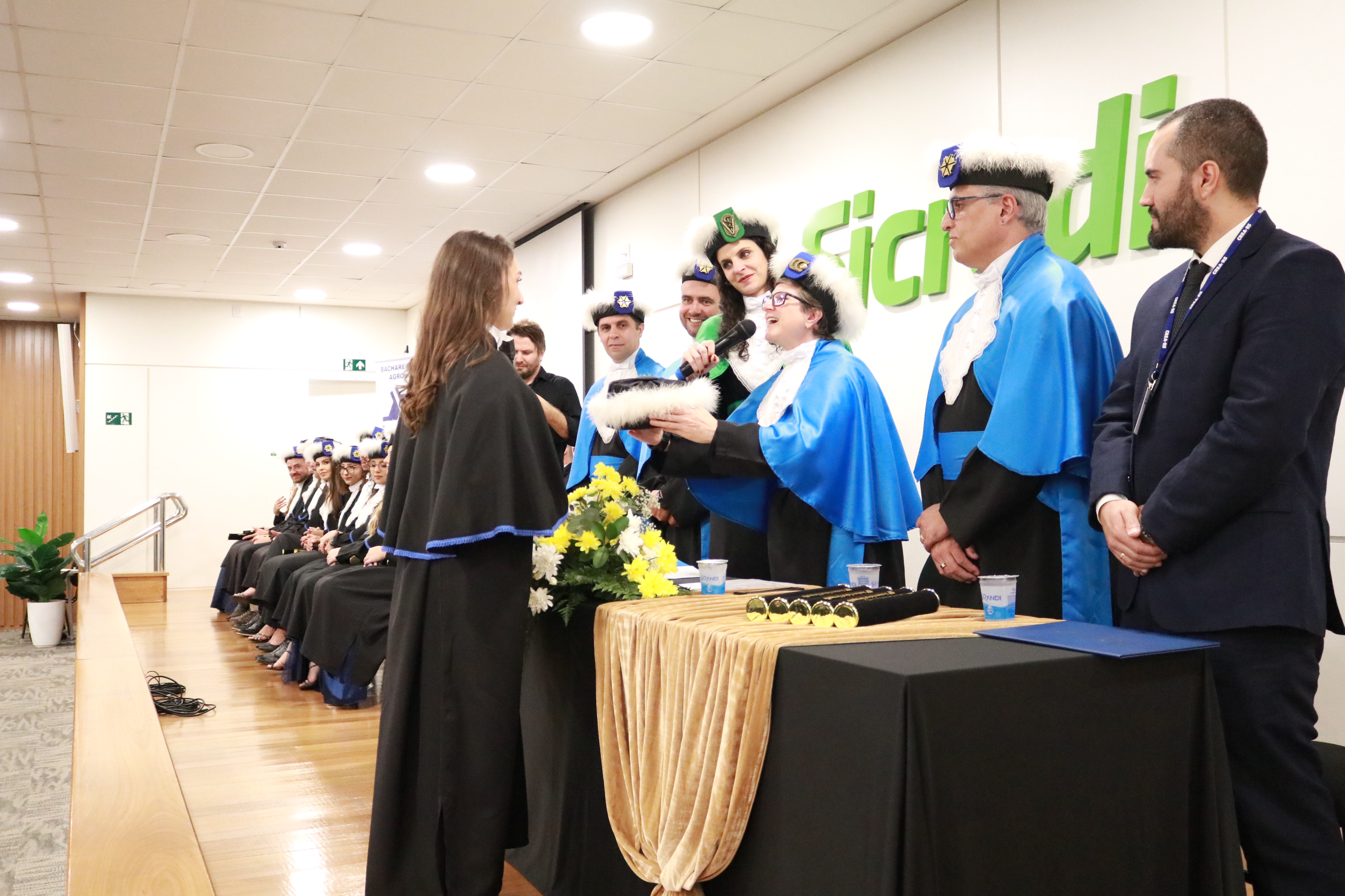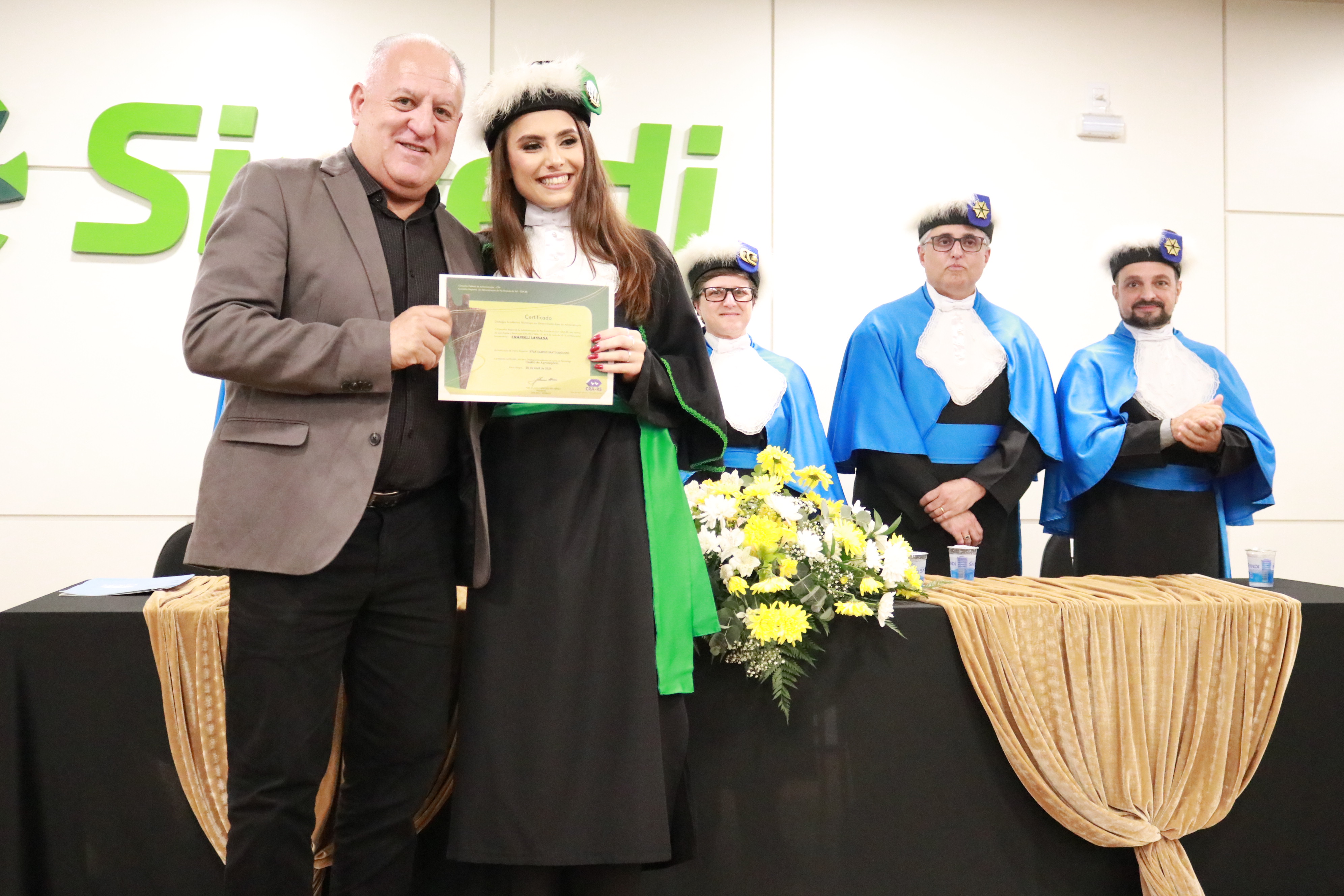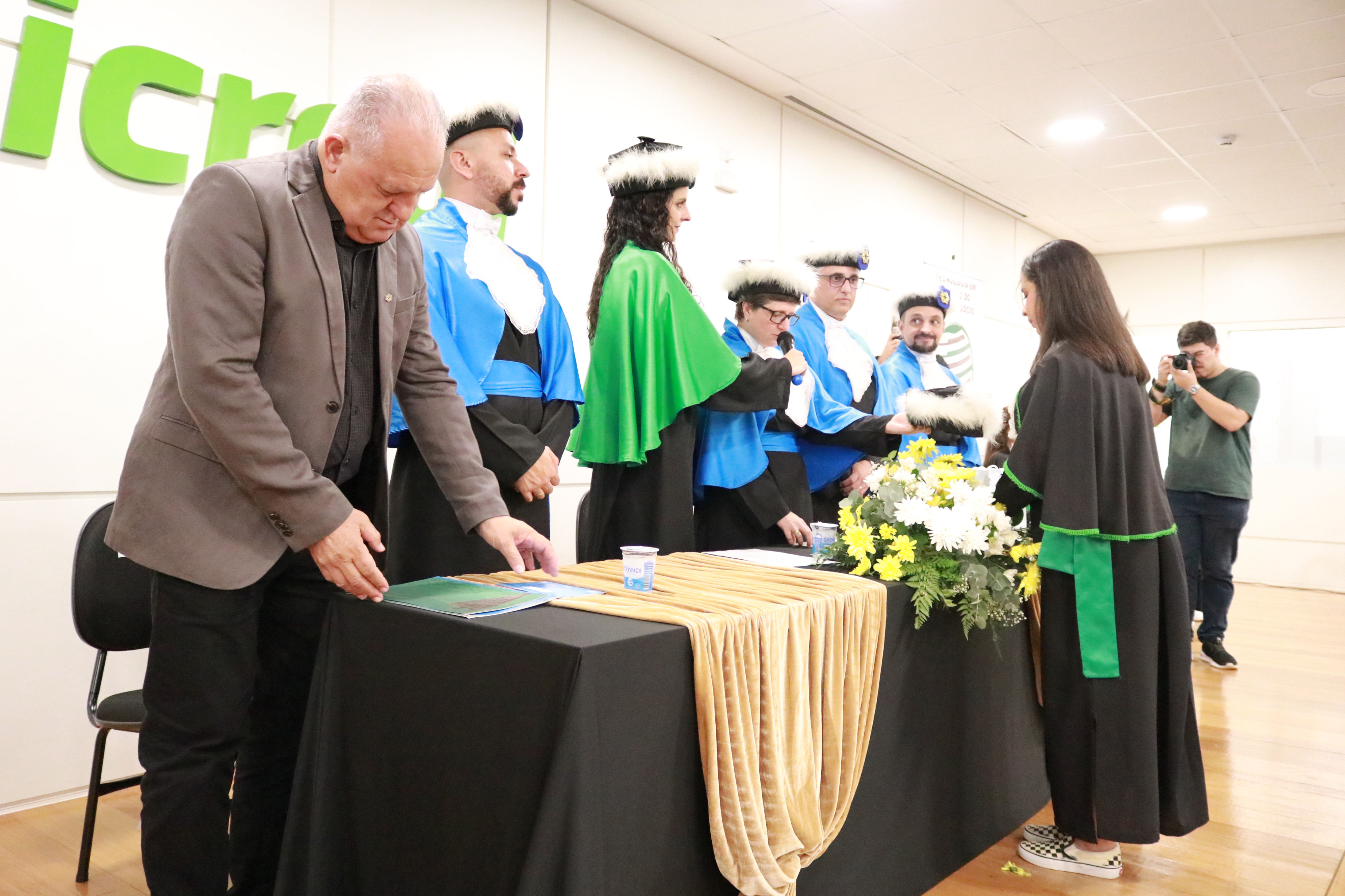 Durante a solenidade, os representantes dos CREA-RS e CRA/RS realizaram a entrega do Certificado de Destaque Acadêmico para o formando de Agronomia, Vitor Daniel Müller, e para a formanda de Tecnologia em Gestão do Agronegócio, Emanoeli Lansana.