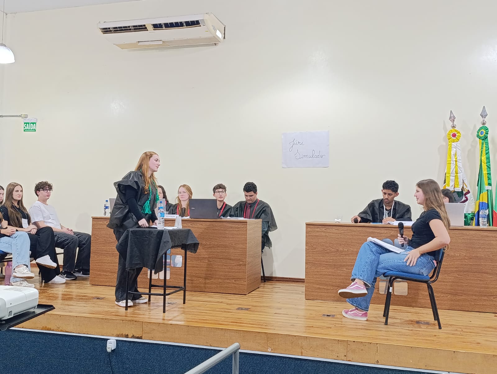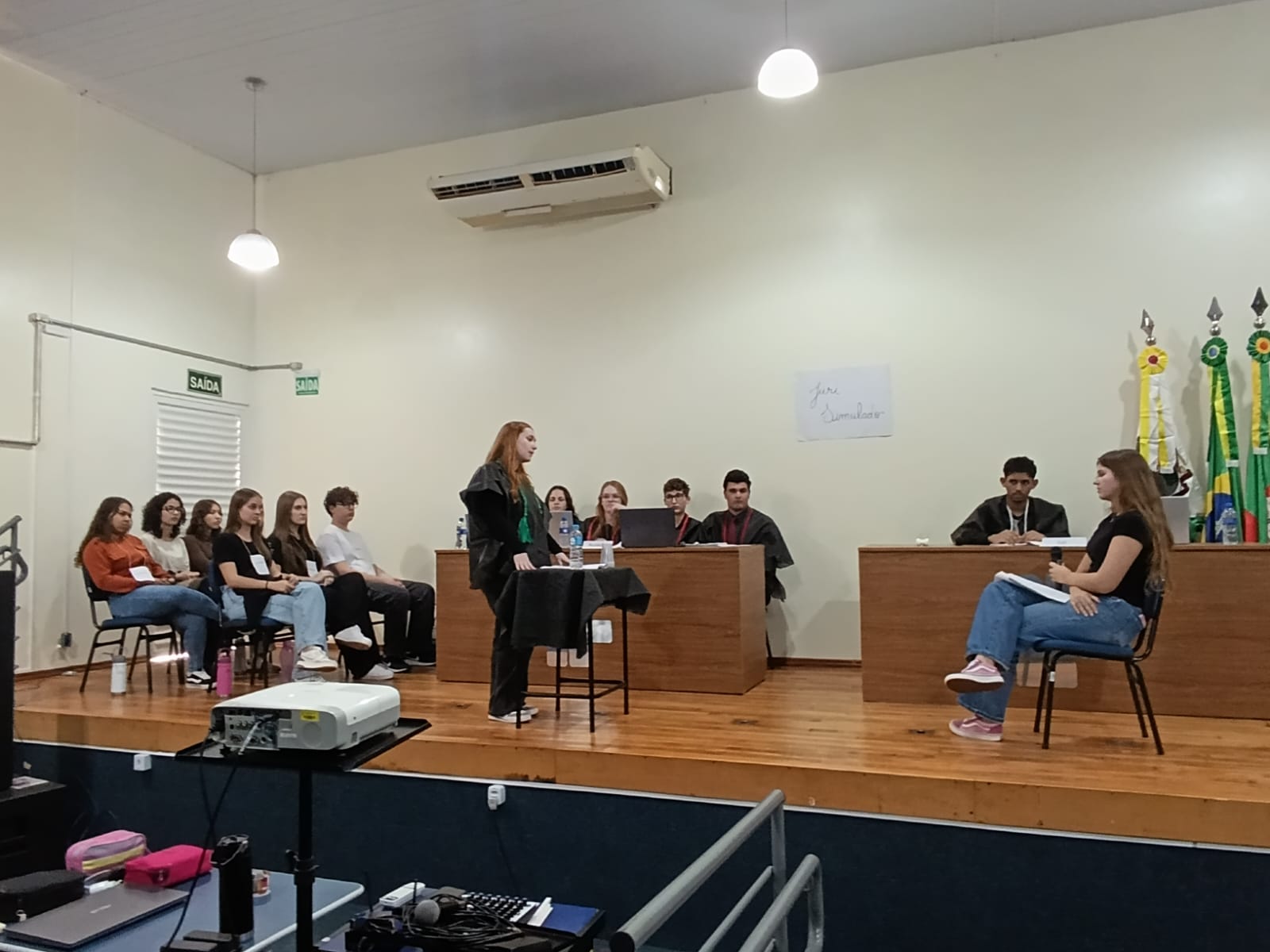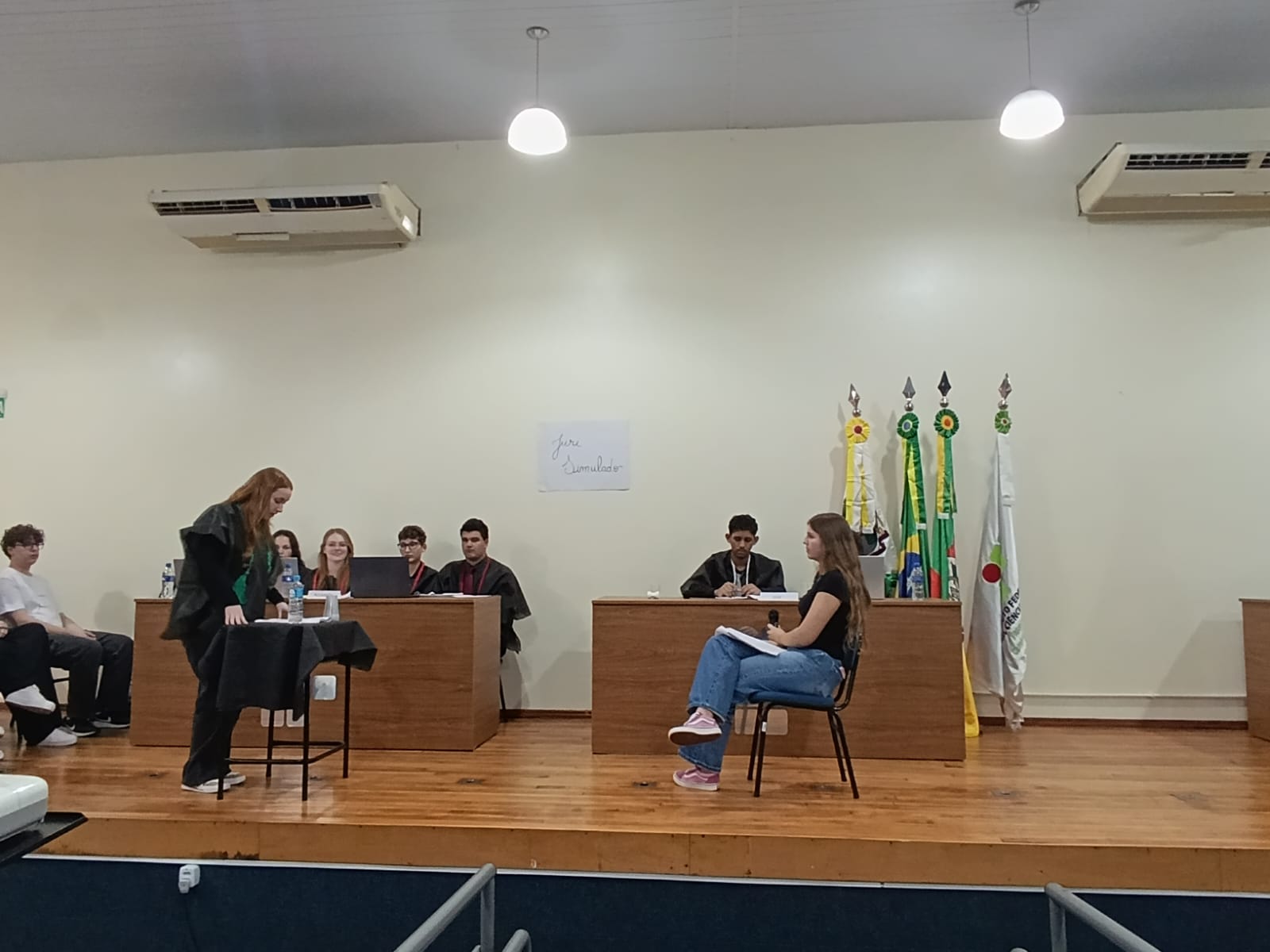 Na ocasião, os estudantes assumiram os papéis de juiz, promotor, defensor, réu, testemunhas e jurados, encenando um julgamento completo, com base em um caso fictício elaborado para estimular o debate jurídico e moral. A atividade contou com a presença dos alunos do 1º e 2º ano do mesmo curso, que participaram como ouvintes, acompanhando o processo e observando a argumentação desenvolvida pelos colegas.