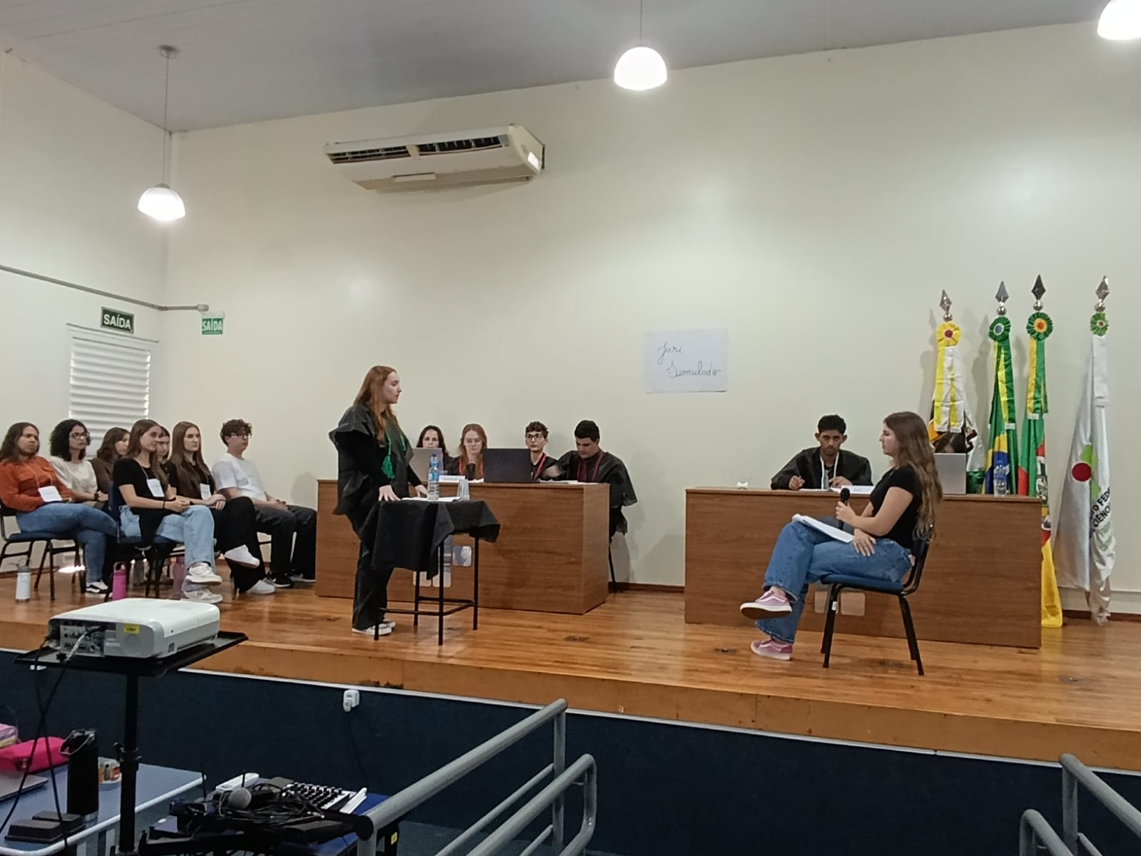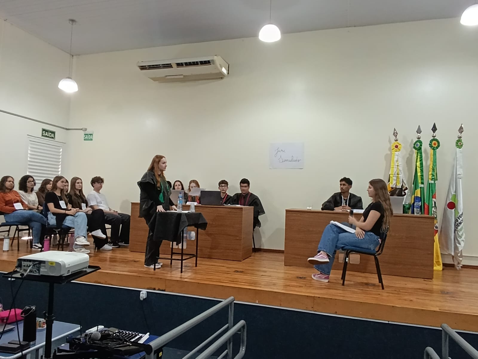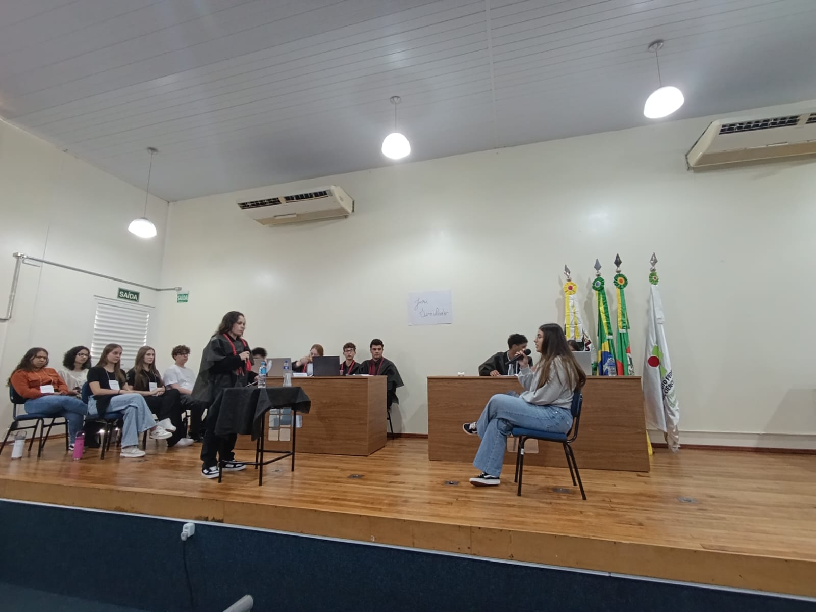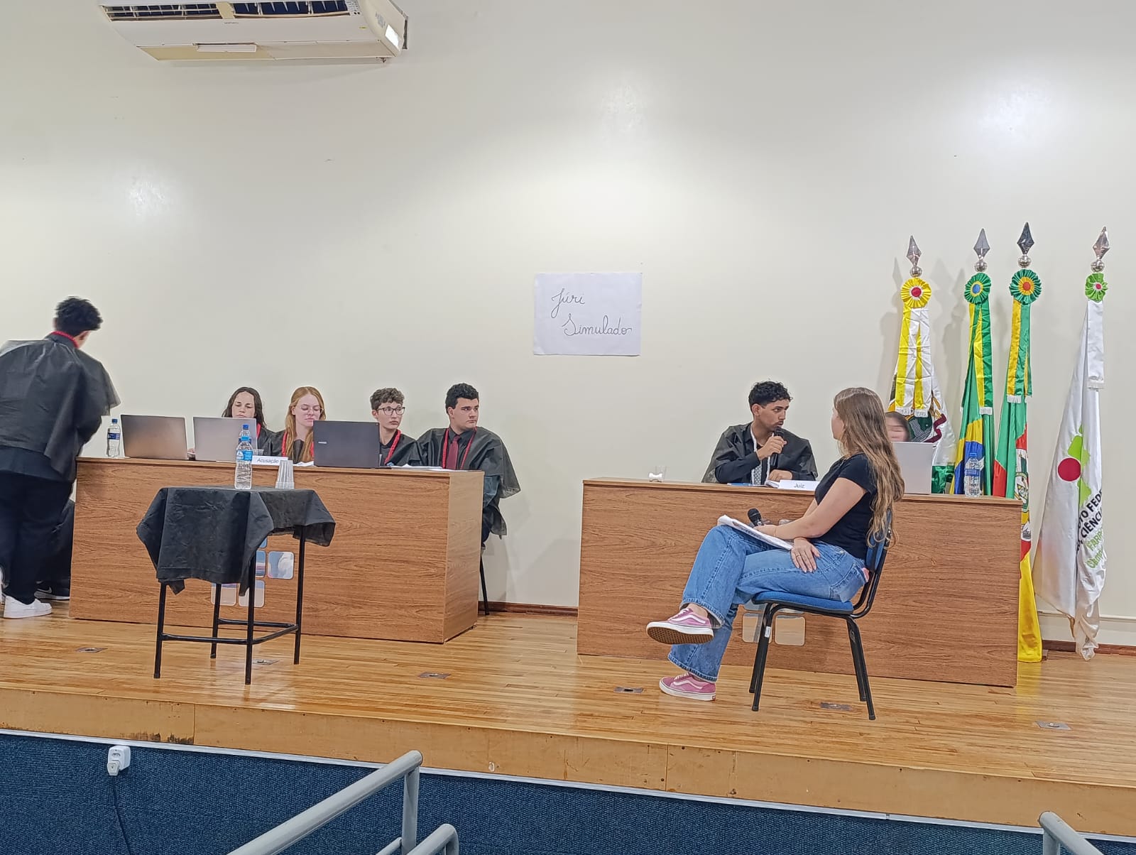 Na ocasião, os estudantes assumiram os papéis de juiz, promotor, defensor, réu, testemunhas e jurados, encenando um julgamento completo, com base em um caso fictício elaborado para estimular o debate jurídico e moral. A atividade contou com a presença dos alunos do 1º e 2º ano do mesmo curso, que participaram como ouvintes, acompanhando o processo e observando a argumentação desenvolvida pelos colegas.