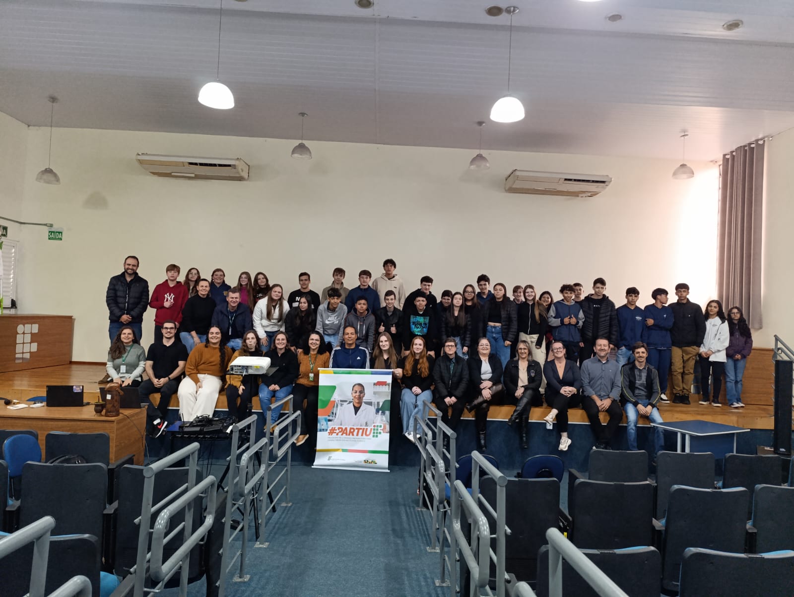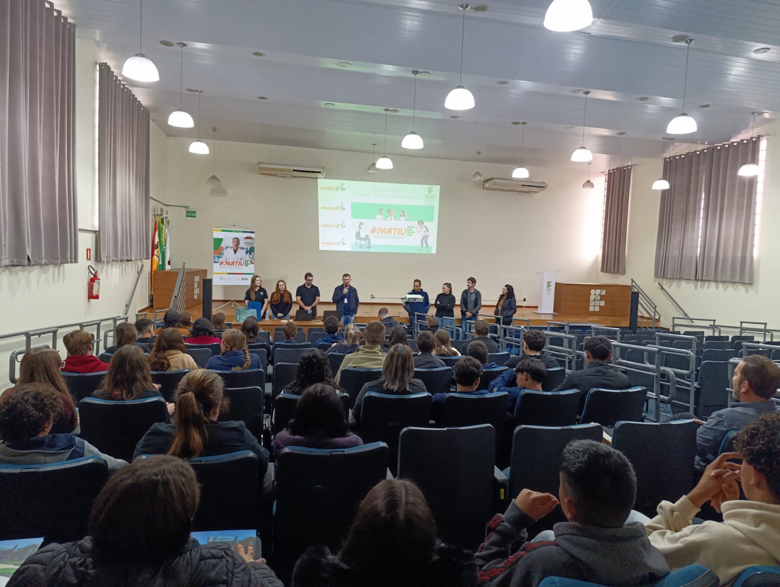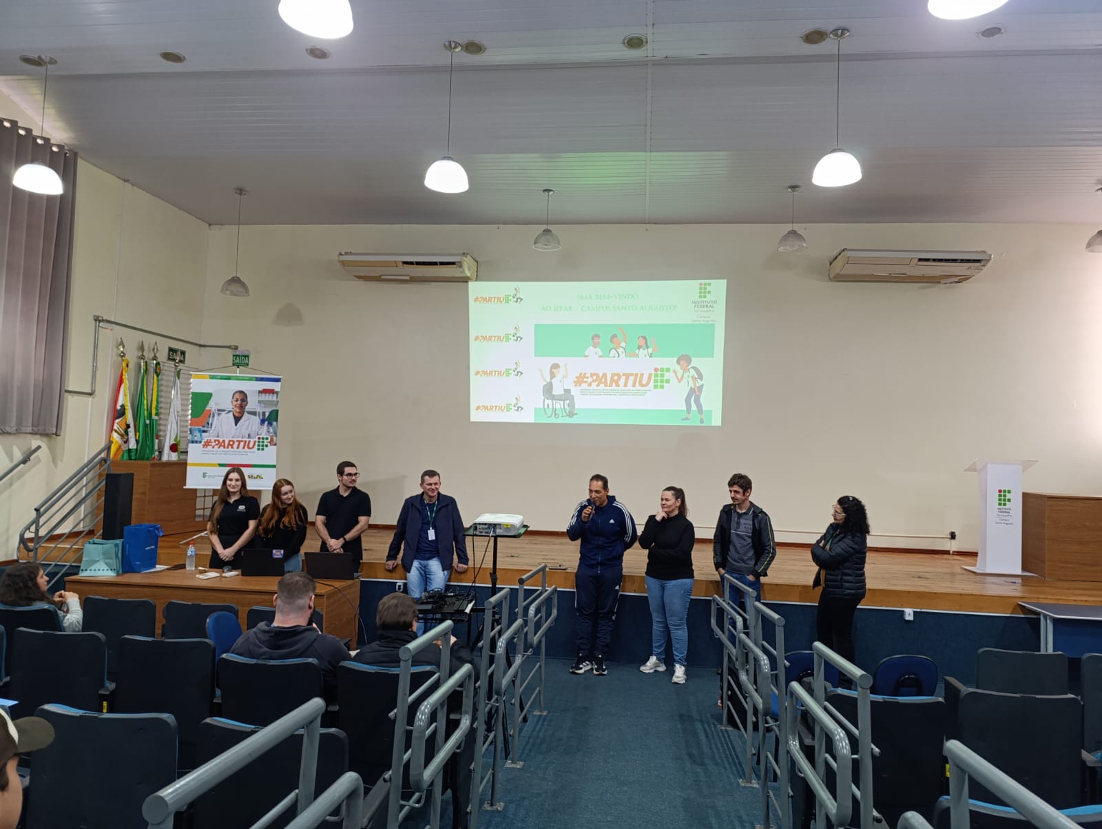 O IFFar – Campus Santo Augusto realizou na tarde desta quarta, dia 18 de junho, a Aula Inaugural do Programa Partiu IF, com a participação da Diretora Geral, Márcia Fink; do Diretor de Pesquisa, Extensão e Produção, Ricardo Paraginski; do assessor pedagógico da Secretaria Municipal de Educação de Santo Augusto, Uianes Biondo; do coordenador do programa, professor Carlos Cesar Wyrepkowski, dos integrantes da equipe do programa Partiu IF, estudantes convidados do IFFar, os alunos selecionados e os professores das escolas participantes.