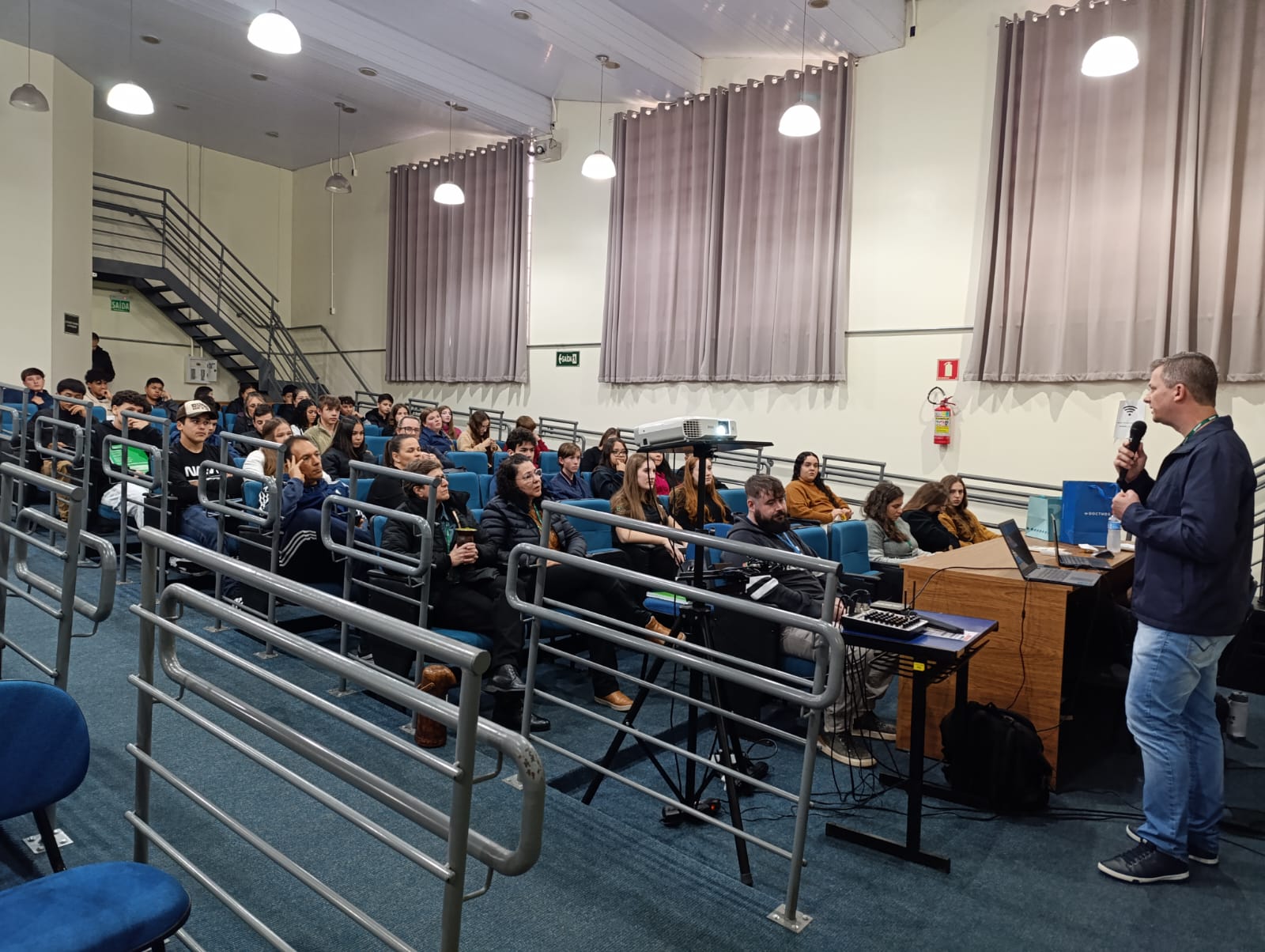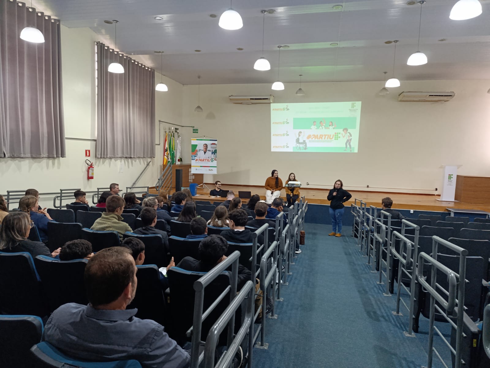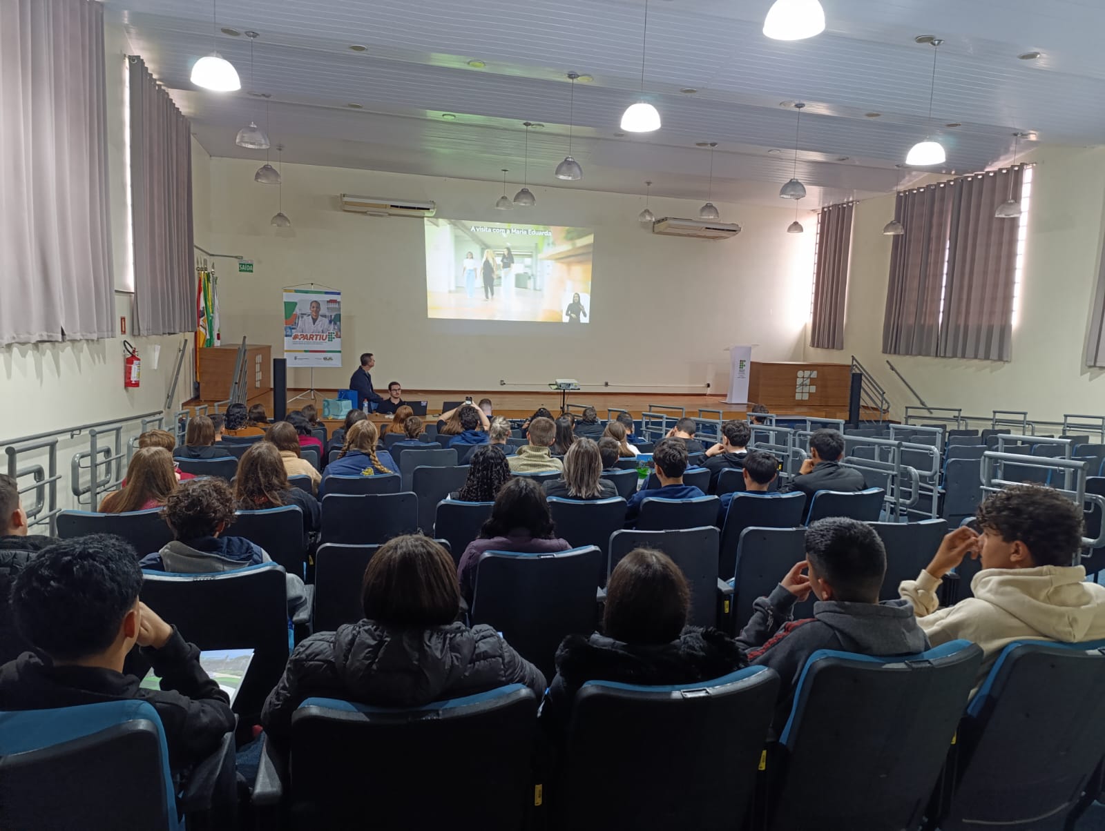 O IFFar – Campus Santo Augusto realizou na tarde desta quarta, dia 18 de junho, a Aula Inaugural do Programa Partiu IF, com a participação da Diretora Geral, Márcia Fink; do Diretor de Pesquisa, Extensão e Produção, Ricardo Paraginski; do assessor pedagógico da Secretaria Municipal de Educação de Santo Augusto, Uianes Biondo; do coordenador do programa, professor Carlos Cesar Wyrepkowski, dos integrantes da equipe do programa Partiu IF, estudantes convidados do IFFar, os alunos selecionados e os professores das escolas participantes.