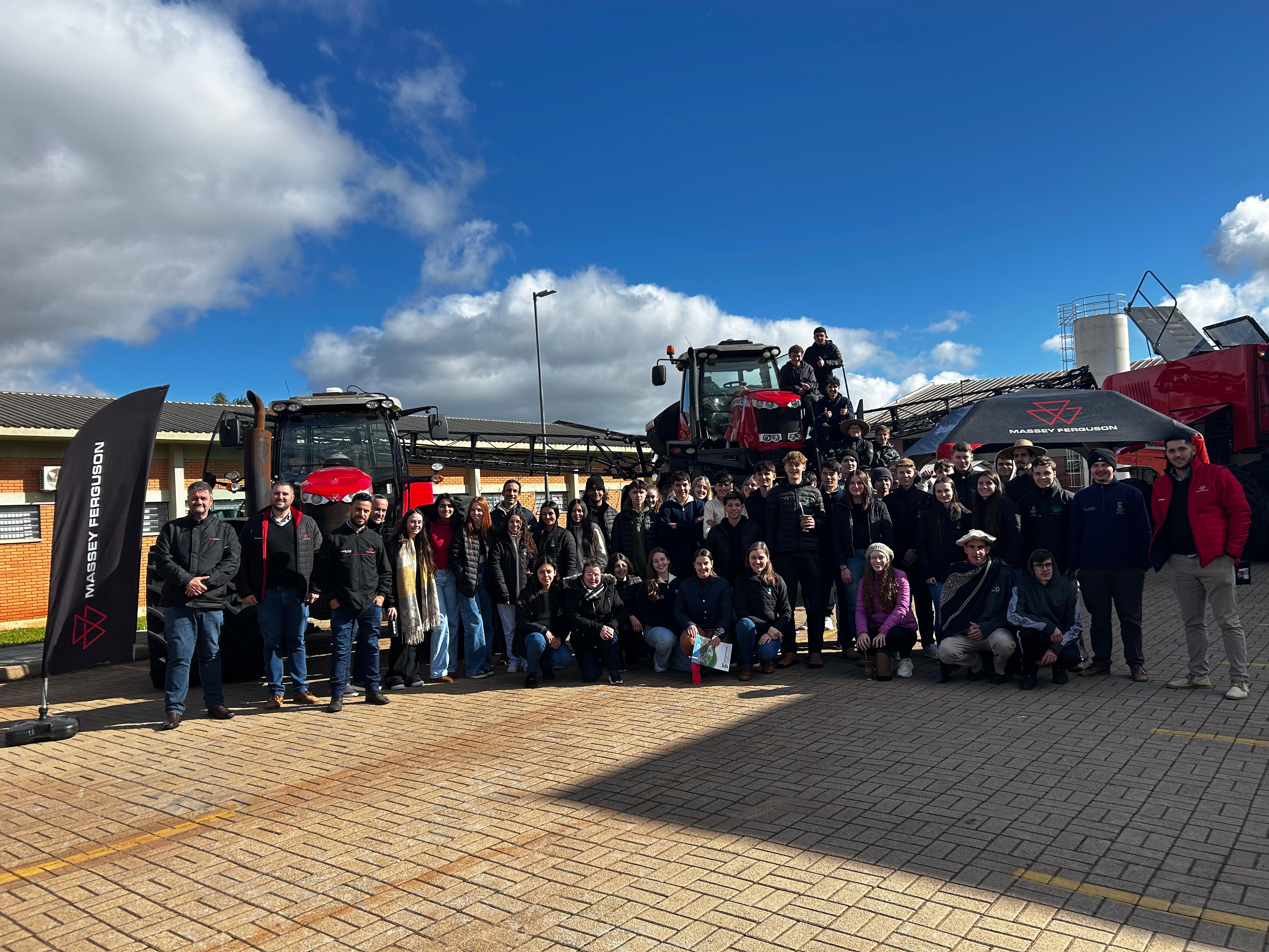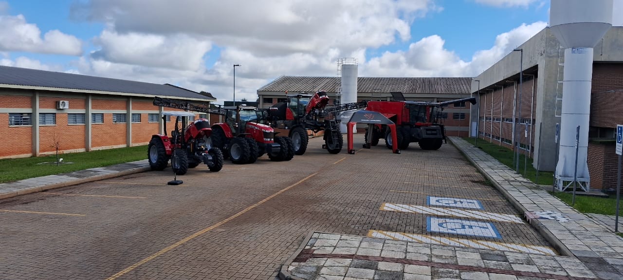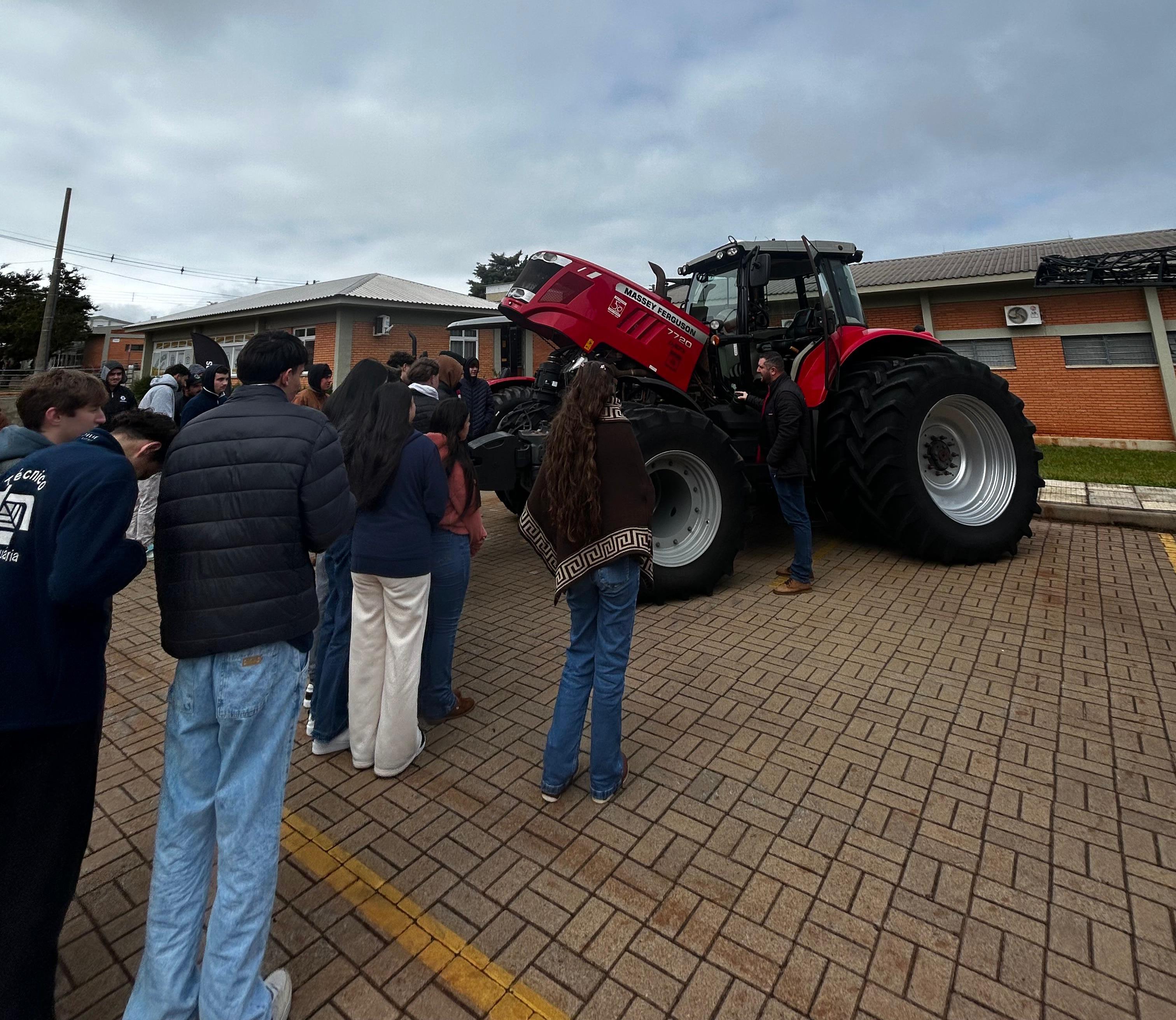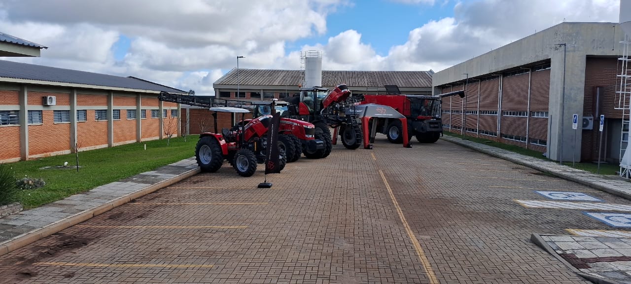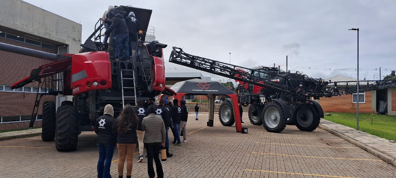 Após as falas no auditório os estudantes puderam conhecer através de demonstração técnica e visitas guiadas no estacionamento da Biblioteca Mario Quintana, a colheitadeira MF 9695, o trator MF 7720, o Trator MF 4707 e o Autopropelido MF 530R.