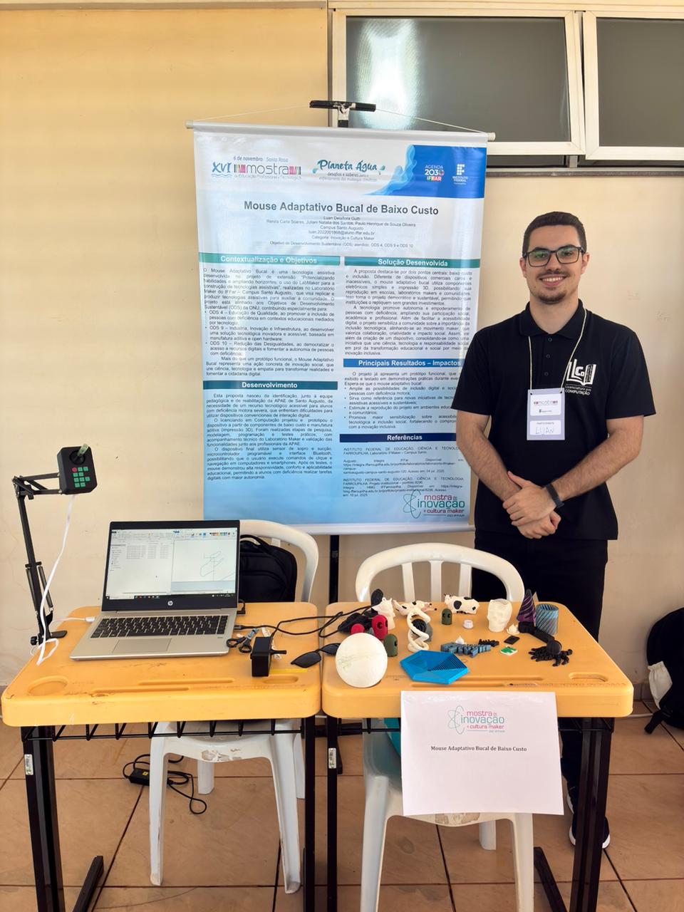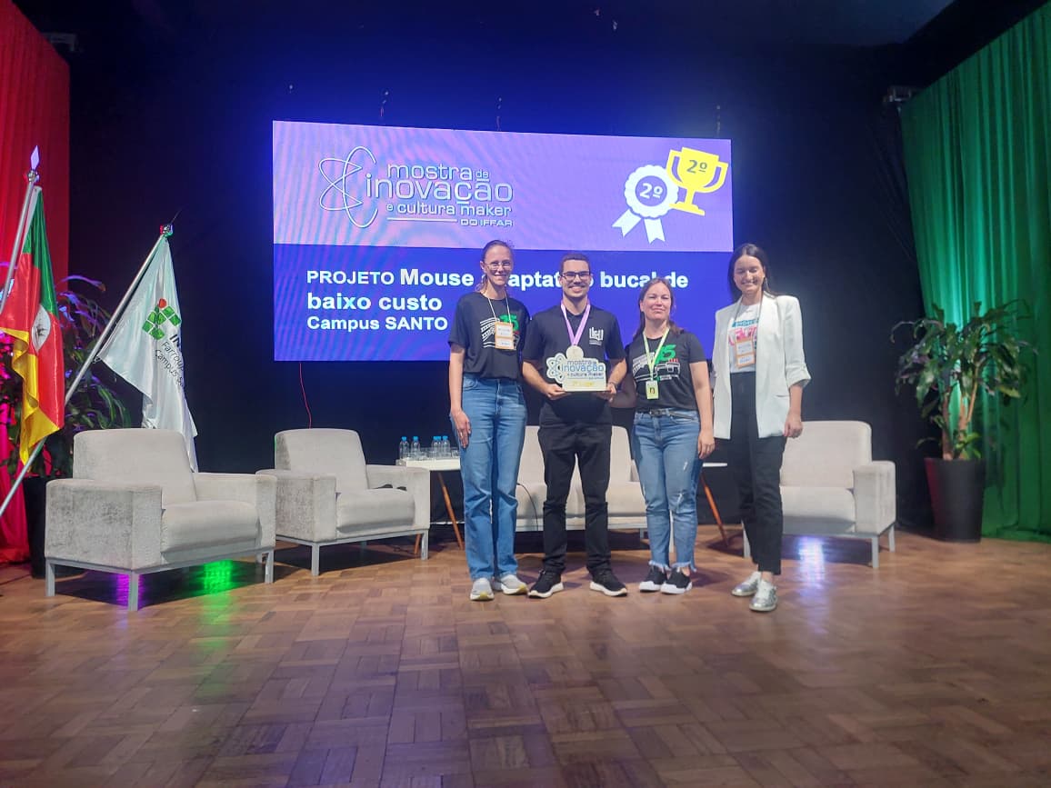 2º lugar na Mostra de Inovação com o trabalho “Mouse Adaptativo Bucal de baixo custo”, do estudante de Licenciatura em Computaçao, Luan Delaflora Guth, sob orientação da professora Renira Carla Soares, e coorientação dos professores, Juliani Natalia dos Santos e Paulo Henrique de Souza Oliveira. O dispositivo foi criado para facilitar o uso de computadores por pessoas tetraplégicas ou com limitações motoras nas mãos, oferecendo uma alternativa acessível e funcional. O protótipo integra o projeto de extensão “Potencializando habilidades e ampliando horizontes: o uso do LabMaker para a construção de tecnologias assistivas”, desenvolvido no Laboratório Maker do IFFar – Campus Santo Augusto.
