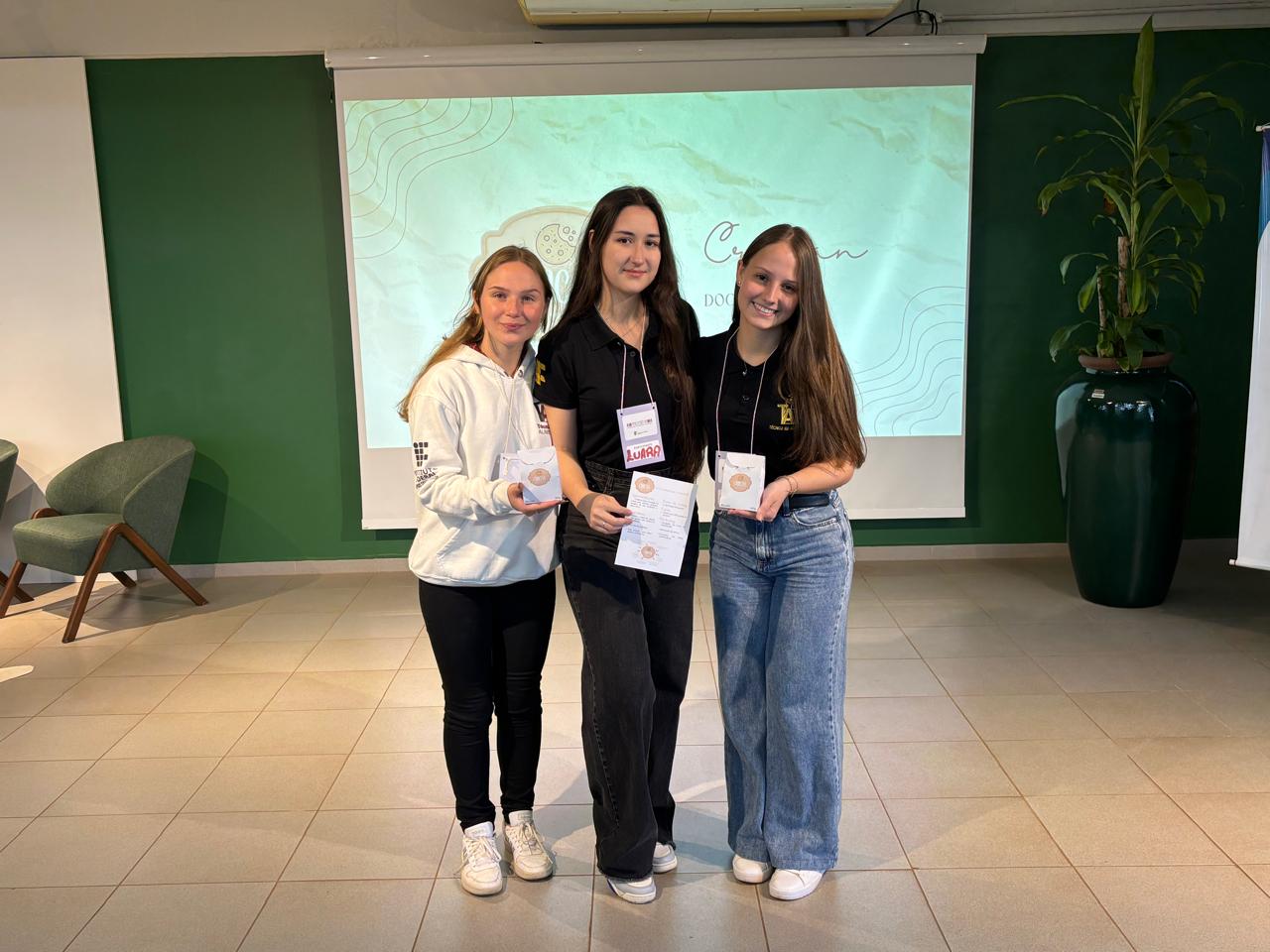 3º lugar no Bye Bye Boss a Equipe Crocan, formada pelas estudantes do técnico em Alimentos, Mileni Graeff Feltes, Luara Canova da Silva e Lais Schimanoski, sob orientação da professora Joice Miliane de Oliveira.