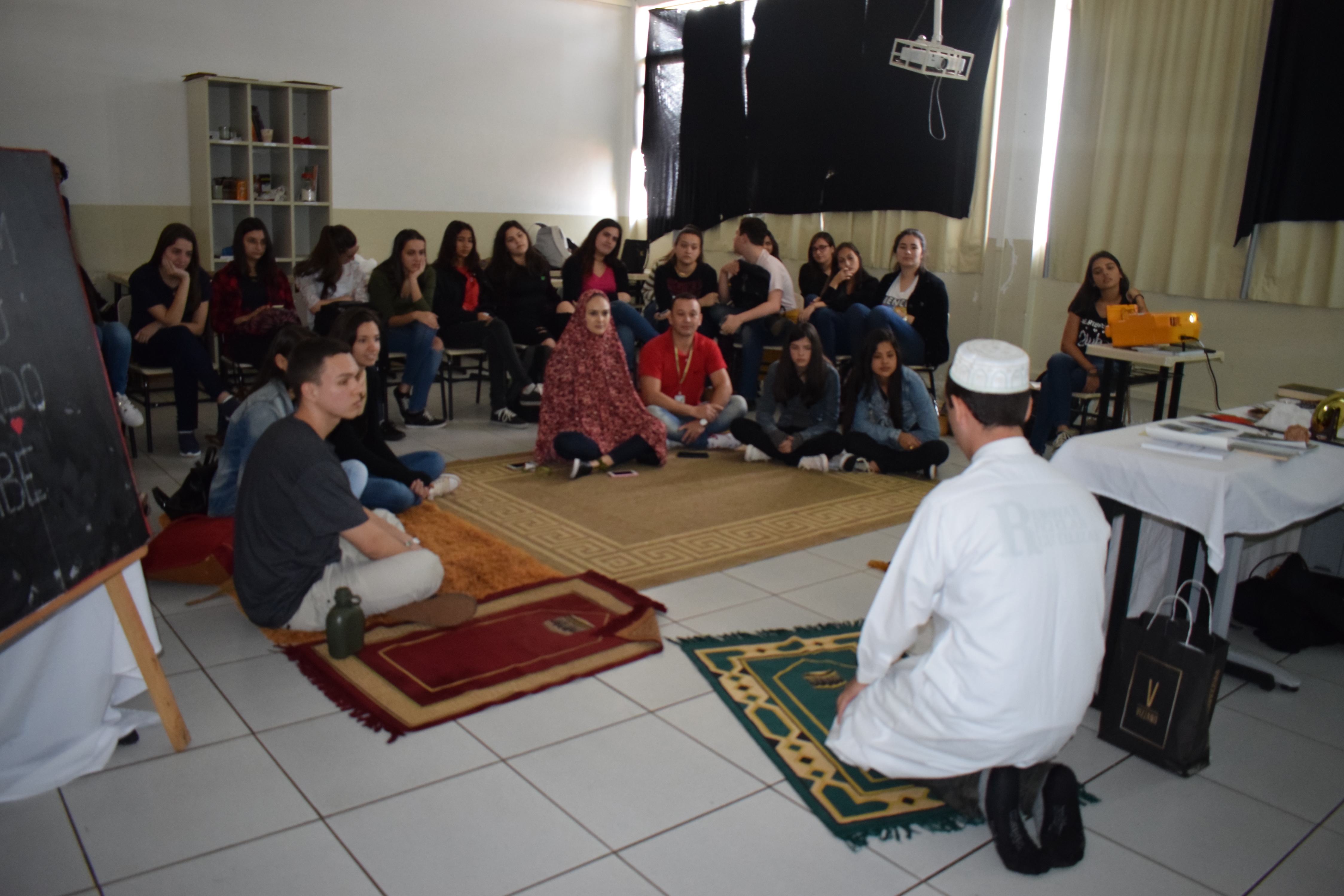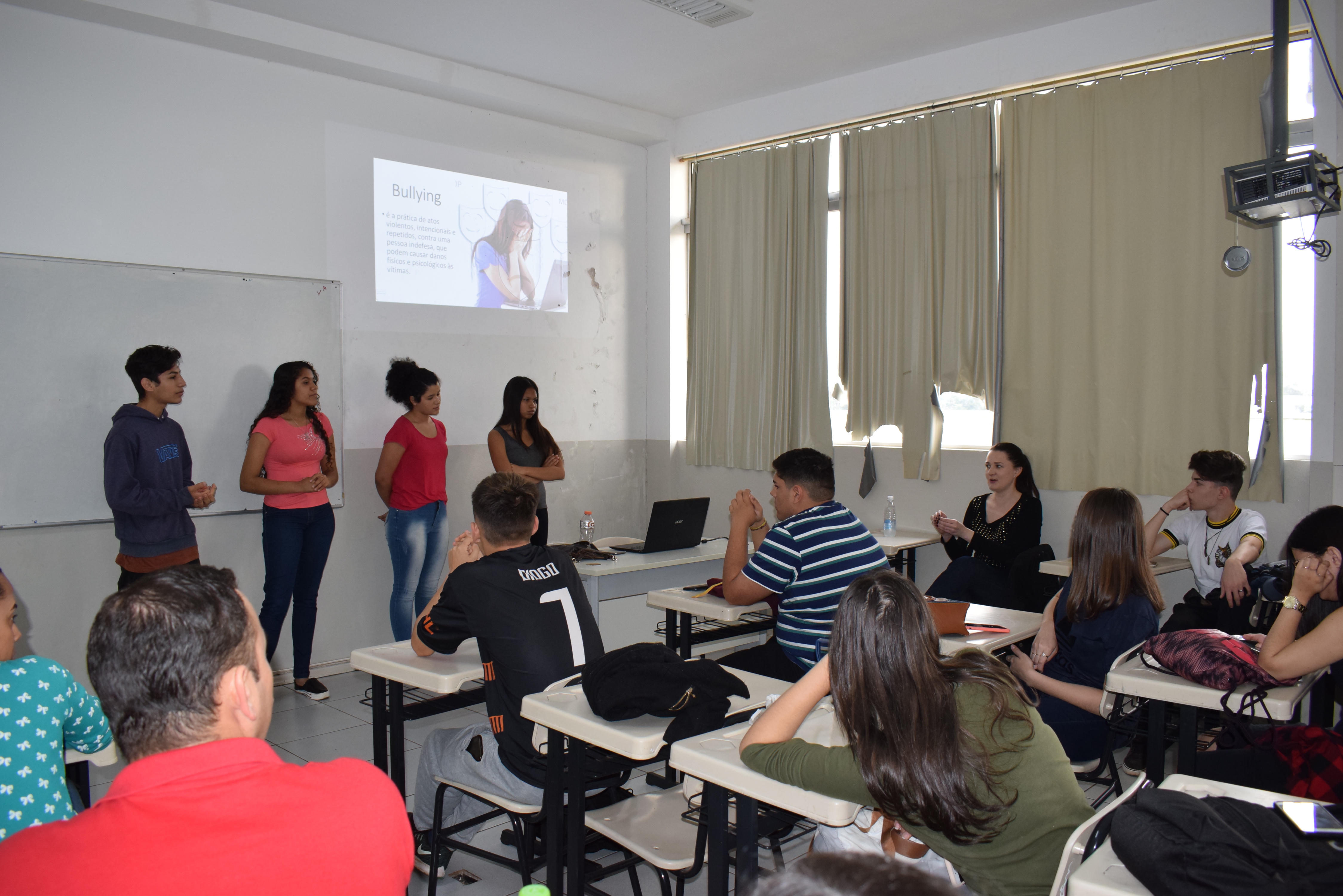 Aline abordou com os alunos os temas medo, insegurança e ansiedade. Explicou como se desvencilhar e lutar contra, focando na solução e não no problema. Ela também falou que o enfrentamento dos problemas, pode gerar a solução dos mesmos e que não se deve evitá-los, pois para ficar mais forte, é preciso infrentá-los.
