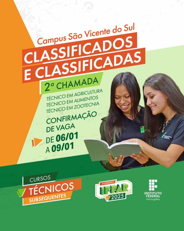O Instituto Federal Farroupilha - Campus São Vicente do Sul, por meio do Edital nº 003/2025, publica a 2ª chamada dos classificados e classificadas no Processo Seletivo para os Cursos Técnicos Subsequentes. A confirmação de vaga acontece no período de 6 a 9 de janeiro de 2025.