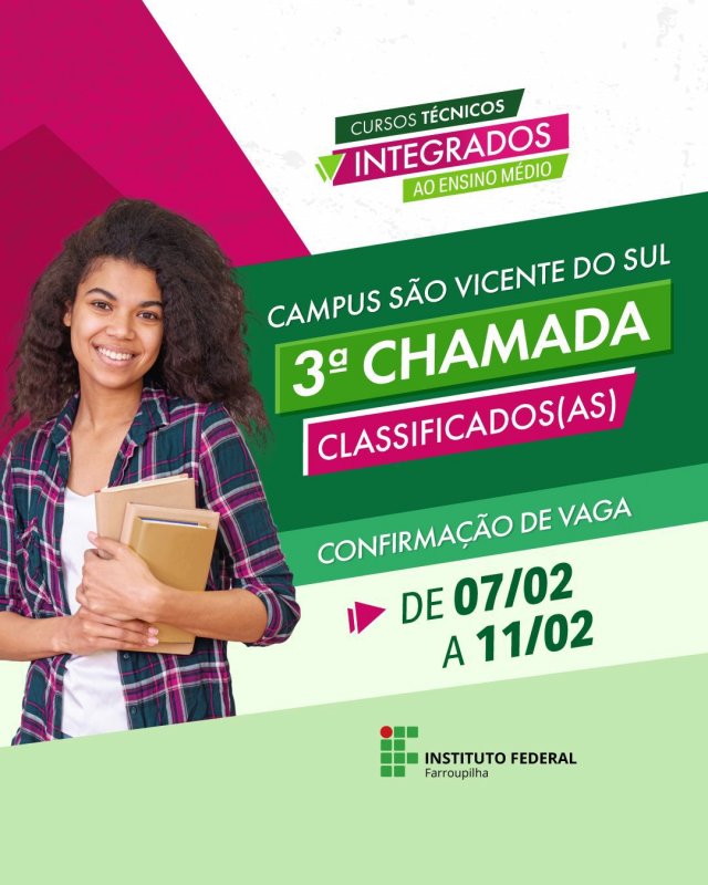 O Instituto Federal Farroupilha - Campus São Vicente do Sul, por meio do Edital nº 018/2025, publica a 3ª chamada dos classificados e classificadas no Processo Seletivo para os Cursos Técnicos Integrados. A confirmação de vaga acontece de 07 a 11 de fevereiro de 2025.
