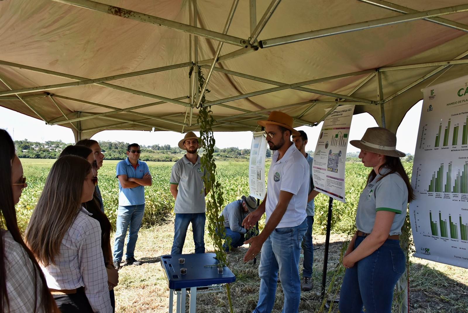 • Estação 2 - Manejo de Plantas Daninhas e Doenças da Soja: manejo preventivo de doenças e manejo químico de plantas daninhas no pré-plantio, pré-emergentes e pós-emergentes na cultura da soja. Participação das empresas: Cotrisel, UPL e URI Santiago.