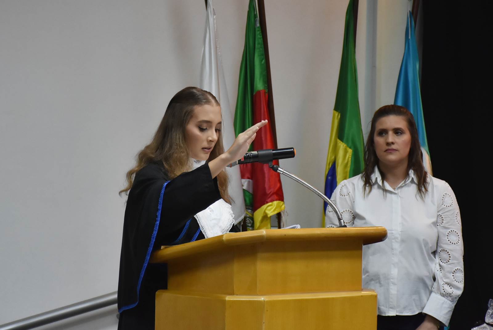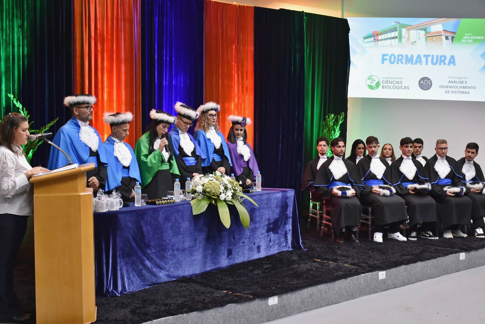 A solenidade ocorreu no Auditório Central da instituição, contando com a presença da pró-reitora de Ensino, Patrícia Donicht; do diretor geral, Paulo Roberto Cecconi Deon; da coordenadora da licenciatura em Ciências Biológicas e patronesse da turma, profª Catiane Paniz; e da paraninfa Janine Bochi do Amaral; do coordenador da ADS, prof. Daniel Boemo; e do patrono Gustavo Rissetti. Além de familiares e amigos dos formandos, também estiveram presentes demais docentes e servidores homenageados pelas turmas.