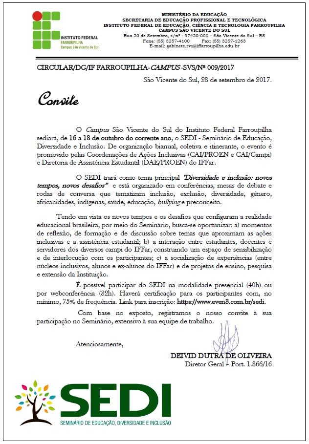 Nos dias 16 a 18 de outubro, o Campus São Vicente do Sul será sede do Seminário de Educação, Diversidade e Inclusão (SEDI). O objetivo do seminário é oportunizar espaços de reflexão, formação e discussão sobre os novos tempos e desafios da realidade educacional brasileira, no que tange à inclusão e à diversidade.